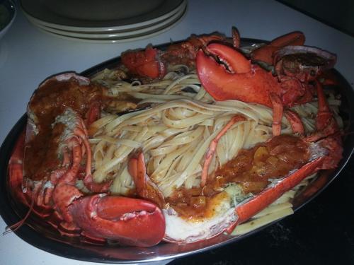 Τραπέζι με καλή παρέα και καλό κρασί. 2 μικροί αστακοί μαζί με μερικά μύδια το κυρίως πιάτο Τους βράζουμε ζωντανους αν δεν τα έχουν κακαρώσει, κόβουμε κεφάλι και ουρά στη μέση, αφαιρούμε στομάχι και εντεράκι και στο πιάτο