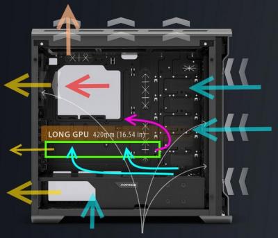 Αν θέλεις να βάλεις έναν ανεμιστήρα στην επάνω πλευρά του κουτιού, δεν έχει νόημα να τον βάλεις σαν εισαγωγής. Θα πρέπει να μπεί σαν εξαγωγής και μάλιστα, η καλύτερη θέση είναι αυτή που είναι πλησιέστερα στην πίσω πλευρά του κουτιού (ροζ βέλος) . Έτσι η ψύκτρα δεν θα στερείται του δροσερού αέρα της, αντίθετα θα υποβοηθείται καθώς όσος ζεστός αέρας βγάζει , θα φεύγει αμέσως από το κουτί , χωρίς να ανατροφοδοτεί την ψύκτρα! Θα έχεις μια καλά καθορισμένη ροή του αέρα , από εμπρός και κάτω προς τα πίσω και πάνω, που συνδυάζει σωστά και την φυσική ανοδική τάση του θερμού αέρα! Για την κάρτα γραφικών : Αυτή η διάταξη της ψύκτρας της έχει ένα θέμα , αλλά δεν μπορείς να κάνεις κάτι , ένα μέρος από τον αέρα της κάρτας θα ανακατεύεται με τον δροσερό αέρα που έρχεται απέξω και θα τροφοδοτεί την ψύκτρα της CPU. Η λύση είναι μπερδεμένη και δύσκολη, οπότε μια καλή κυκλοφορία του αέρα και η αποφυγή των έντονα θετικών πιέσεων (χωρίς αυτές βέβαια να γίνουν αρνητικές! ) θα βοηθήσει τη κατάσταση. Παίξε με τις στροφές του επάνω /πίσω ανεμιστήρα να δείς που είσαι καλύτερα. Επίσης να παρακολουθείς την πίεση του κουτιού, για να ρυθμίσεις σωστά τις στροφές όλων των ανεμιστήρων με βάση το θόρυβο , αλλά και την απόδοσή τους. Καλή συνέχεια, και αφού έχεις διάθεση για ψάξιμο , για γράψε και εδώ , τι αποτελέσματα έχεις !