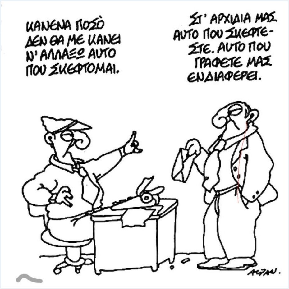 Είναι δικαίωμα της Καλλιόπης να μην μαθαίνει ο καθένας πόσο ζυγίζει ο κώλος της και πόσο ζημιά είναι μόνο εκείνη ξέρει . Ο καθένας μας έχει δικαίωμα μόνο στον δικό του κώλο Από τον δανεισμό, στον εκπατρισμό αρχαιοτήτων, μια αγορά δρόμοςΤο χρονικό ενός προαναγγελθέντος εγκλήματος Για έναν αιώνα ήταν αρχικά ο νόμος αλλά έγινε χαμός και πέσανε στα μισά. Πεδίο κονόμας λαμπρό -