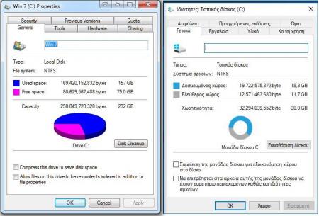 Κάνε κάτι ακόμα, αν δεν το έχεις κάνει. Απενεργοποίησε την επιλογή να υπάρχει ευρετήριο στον δίσκο. Παρακάτω η εικόνα είναι ολίγον από όλα. Win7 αγγλικά και Win10 Ελληνικά. Αυτό που θέλεις είναι το τελευταίο κουτάκι να ΜΗΝ είναι επιλεγμένο. Έχω περάσει τα Win10 προσωρινά σε έναν αρχαίο SSD 32GB με JMicron controller(τον γνωστό τραγικό controller) και ήταν μόνιμα στο 95-100% usage μέχρι που πριν λίγο του έκοψα το index/ευρετήριο και ηρέμησε. -
