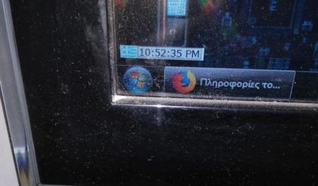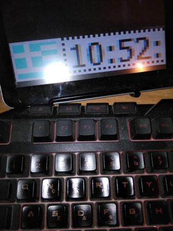 Κάποια στιγμή σταμάτησα να το χρησιμοποιώ με αυτόν τον τρόπο το tablet. Αλλά βρήκα άλλη ιδέα για αξιοποίησή του, χρήσιμη όταν έχεις να γράψεις κείμενα που θέλουν εναλλαγές Ελληνικού και Αγγλικού πληκτρολογίου και δεν γνωρίζεις τυφλό σύστημα (που σημαίνει ότι αν δεν πιάσει το Shift+Alt κάθεσαι και γράφεις σε λάθος γλώσσα χωρίς να το έχεις καταλάβει). Πάλι TightVNC, πάλι εμφάνιση συγκεκριμένου κομματιού της οθόνης στην οθόνη του tablet. Η ευχάριστη έκπληξη εδώ είναι ότι όταν στέλνεις μικρότερης ανάλυσης εικόνα σε αυτή του tablet, το VNC πρόγραμμα του tablet κάνει αυτόματα μεγέθυνση. Ουσιαστικά στέλνω ένα κομματάκι 60 x 32 pixels σε μια οθόνη ανάλυσης 800 x 480 pixels. Η ιδέα είναι να έχω το tablet ακριβώς δίπλα στο πληκτρολόγιο, έτσι ώστε να έχω ανά πάσα στιγμή εικόνα της γλώσσας που είναι ενεργή. Μιλάμε για το ίδιο αρχαίο tablet με Android 1.6, 128ΜΒ μνήμης και μονοπύρηνο VIA επεξεργαστή στα 150-300MHz. Τροφοδοσία από το τροφοδοτικό του, μόνο όταν χρειάζεται. Όταν δεν χρειάζεται απλά βγάζω το καλώδιο της τροφοδοσίας Ευτυχώς δουλεύει χωρίς μπαταρία, ευτυχώς δεν τα έχει παίξει.