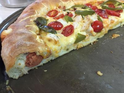 Πίτσα με τυρί κοτόπουλο πιπεριά και τοματινι και στη κρουστά μεσα, λουκάνικο Φρανκφούρτης και κεφαλογραβιέρα Μετσόβου.