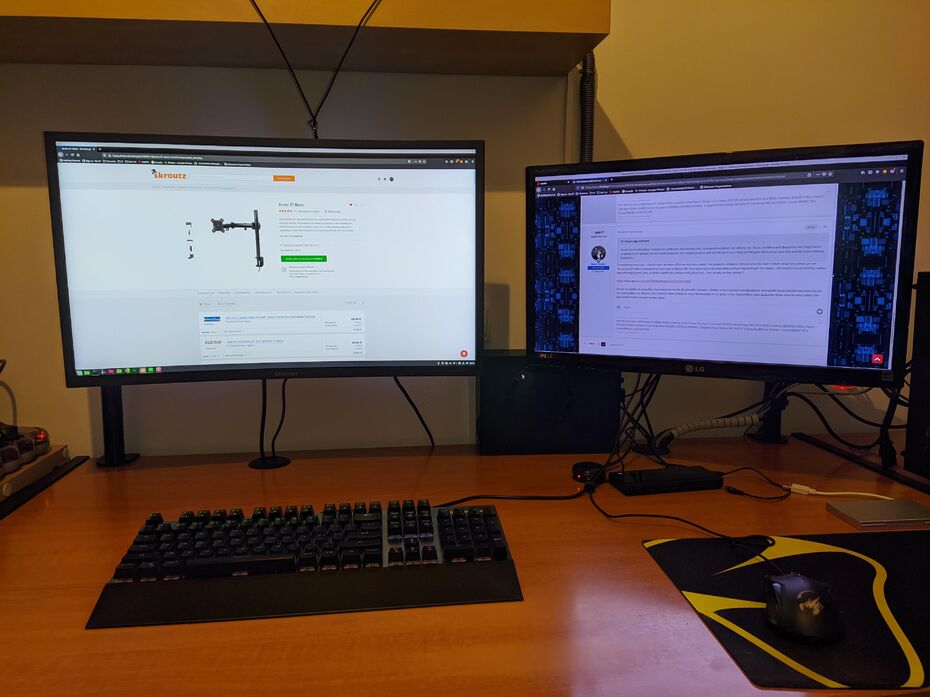 Καλησπέρα, δες το δικό μου setup (27" & 23") με δυο βραχίονες τι χώρο κερδίζω. Οι βραχίονες είναι οι Arctic Z1 Basic. -