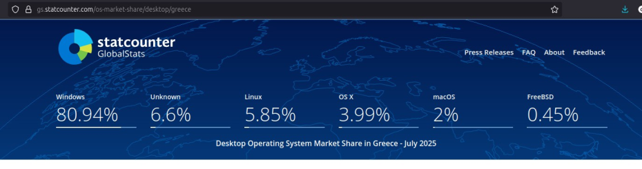 Με μια γρήγορη ματιά... μάλλον λάθος τα βλέπεις: Και υπολόγισε ότι τα περισσότερα από τα "Unknown" είναι linux που λόγω ιδιαίτερης ευαισθησίας των χρηστών σε privacy έχουν πειραγμένα user agents για να μην φαίνεται η ταυτότητά τους. https://gs.statcounter.com/os-market-share/desktop/greece