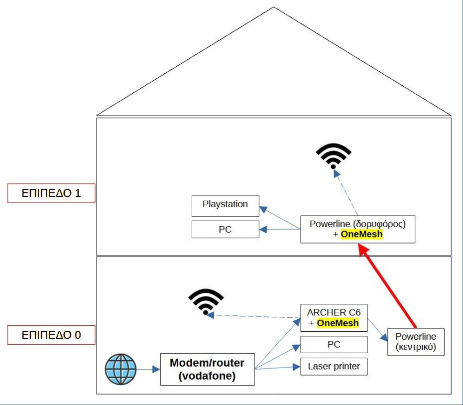 Λοιπόν στο σπίτι μου μέχρι στιγμής λειτουργεί άψογα η παρακάτω συνδεσμολογία: Το πρόβλημα που μου έχει σπάσει τα νεύρα το τελευταίο διάστημα γιατί το συναντώ όλο και πιο συχνά είναι ότι αν π.χ. μιλάω στο viber από το κινητό και κινούμαι στο σπίτι αλλάζοντας όροφο (ενώ το κινητό είναι στο wifi) τρώω ΑΚΥΡΟ!!!! Αν ξεκινήσω τη συνομιλία στο ΕΠΙΠΕΔΟ 0 και την ώρα που μιλάω μετακινούμαι στο ΕΠΙΠΕΔΟ 1, το κινητό μένει πεισματικά συνδεδεμένο στο wifi του ΕΠΙΠΕΔΟΥ 0, με οριακό σήμα (χάνω τον συνομιλητή μου), μέχρι που θα αποσυνδεθεί και θα συνδεθεί στο WIFI του ΕΠΙΠΕΔΟΥ 1, οπότε συνήθως πέφτει και η γραμμή μέχρι να γίνει η επανασύνδεση. Και σε αρκετές άλλες περιπτώσεις έχω παρόμοια προβλήματα αλλά δεν χρειάζεται να τις αναφέρω όλες. Η λύση είναι κάποιο σύστημα mesh. Δυστυχώς όμως ΔΕΝ μπορώ να χάσω το powerline. α) Χρειάζομαι το καλύτερο δυνατό latency στο ΕΠΙΠΕΔΟ 1 (λύση να φέρω ethernet από το ΕΠΙΠΕΔΟ 0 έχει απορριφθεί λόγω μερεμετιών και κόστους), ενώ ένα οποιοδήποτε ΑΠΛΟ σύστημα mesh θα παίρνει WIFI μέσω της πλάκας των ορόφων που σημαίνει ότι έχω μεγάλη απώλεια ταχύτητας (το έχω τσεκάρει, μέσω WIFI χάνω 50-75% από όροφο σε όροφο). Ευτυχώς για περιπτώσεις σαν τη δικιά μου κυκλοφόρησαν προσφάτως λύσεις: α) DEVOLO magic 2 next , το οποίο είναι powerline + mesh (hybrid). Όμως για να παίξει το mesh, δεν ξεμπερδεύω με 2 σταθμούς (o κεντρικός δεν δίνει wifi). Επομένως χρειάζομαι το κεντρικό powerline + 2 δορυφόρους, έναν για κάθε όροφο. Με κεντρικό σταθμό και 2 δορυφόρους λοιπόν, το κόστος εκτοξεύεται και είναι απορριπτέο (~300€) β) Η TP-Link βγάζει μια πολύ συμπαθητική hybrid λύση, το DECO P9 το οποίο χρησιμοποιεί για network backhaul τεχνολογία powerline. Κόστος ~150€ και είμαστε εντός budget! Το μέγα πρόβλημα όμως είναι ότι δεν φαίνεται να υποστηρίζει την επιλογή “lower PLC-to-VDSL”. Τι είναι αυτή η επιλογή θα ρωτήσετε και δικαίως. Λοιπόν σε πολλές περιπτώσεις το powerline μαζί με VDSL δεν παίζουν καλά μαζί, καθώς υπάρχουν παρεμβολές. Έτσι μπορεί να έχεις αποσυνδέσεις ή και μείωση ταχύτητας στη VDSL σου. Τη λύση έρχεται να δώσει κάποιο ειδικό mode λειτουργίας του powerline που περιορίζει τις παρεμβολές αυτές με μια μικρή θυσία στην ταχύτητα διασύνδεσης μεταξύ των δορυφόρων του powerline, που όμως είναι αδιάφορη στην πράξη γιατί ούτως ή άλλως ξεπερνάμε την 100άρα VDSL. Αυτή την επιλογή την έχω ήδη ενεργοποιημένη (lower PLC-to-VDSL) στην υπάρχουσα διασύνδεσή μου για να μην έχω προβλήματα (που είχα πριν την ενεργοποιήσω). Αυτή η επιλογή δεν εμφανίζεται στο web interface του powerline, αλλά την ενεργοποιείς μέσω ειδικού app που μπορείς να κατεβάσεις από την TP-LINK. Αυτό το app λοιπόν δεν φαίνεται διαθέσιμο στις λήψεις του DECO P9 οπότε υποθέτω ότι δεν υπάρχει και σαν δυνατότητα… Έχω στείλει ερώτημα στην TP-LINK για το θέμα, αλλά δεν ξέρω αν θα μου απαντήσουν. γ) Η τρίτη λύση που σκέφτηκα είναι “μέσω Τριπόλεως” αλλά φαίνεται να είναι η μόνη που μου εξασφαλίζει (???) επιτυχία. Τα νέα “απλά” powerline της TP-LINK είναι συμβατά με τεχνολογία ΟneMesh της TPLINK, εφόσον συνεργάζονται με αντίστοιχης τεχνολογίας router της TP-LINK (συμβατό με OneMesh). Δηλαδή αγοράζω ένα ρουτεράκι της TP-LINK (archer C6 ~ 50€) και ένα καινούργιο powerline της TP-LINK (WPA 8631P ~ 90-100€). Το πακετάκι θα βγει 150++ € αναλόγως πού θα βρω διαθεσιμότητες και σε ποιες τιμές. Δηλαδή η συνδεσμολογία μου θα διαμορφωθεί έτσι: Όσοι λοιπόν είστε “δικτυάδες” ή έχετε παρόμοιες ανάγκες με εμένα, τι γνώμη έχετε? Θα δουλέψει η τρίτη λύση? Υπάρχει κάτι που δεν έχω σκεφτεί? Κάθε άποψη ευπρόσδεκτη!