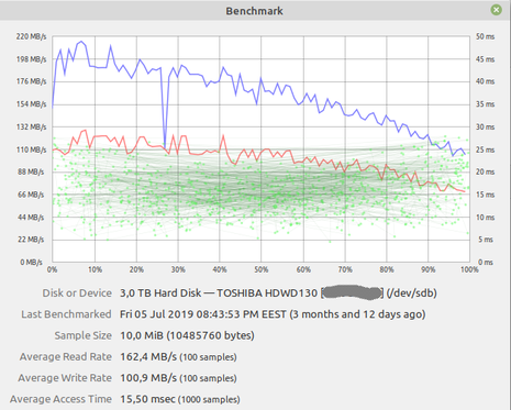 Χαρά στο κουράγιο σου.... Δεν ξέρω αν αυτό συνιστά πρόβλημα, εξαρτάται από τα settings του benchmark. Αν έγγραφε μεγάλα και πολλά samples σε όλη την επιφάνεια των δίσκων, ίσως είναι λογικό να πήρε τόσες ώρες. Δεν χρησιμοποιώ win και δεν έχω άποψη. Εξαρτάται τι γράφει. Μπορεί να υπάρχει θέμα, μπορεί και όχι. Ο δικός μου αρχαιότερος δίσκος (σχεδόν δεκαετία) δίνει αυτά στο HDSentinel (linux version): Γενικά μην κάνεις "αργό" format. Φθείρεις χωρίς λόγο τους δίσκους. Επειδή έχω και εγώ τον Toshiba P300, ιδού οι δικές μου επιδόσεις σε Ext4 FS στο linux για να συγκρίνεις: