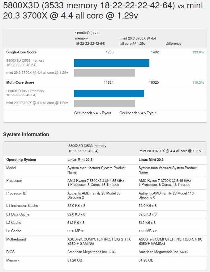 Εντάξει είναι να μην έχεις το μικρόβιο... Ξανά μανά! 3200 μνήμες CL16 Βάζω το side panel +100 πόντους geekbench. mint 20.3 5800X3D (3200 memory CL16) vs mint 20.3 3700X @ 4.4 all core @ 1.29v - Geekbench Browser BROWSER.GEEKBENCH.COM -