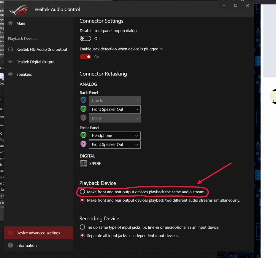Αυτή την επιλογή τη δοκίμασες? Επίσης επειδή η ASUS παίρνει τους default realtek drivers και τους πειράζει για να γίνονται πιο φαντεζί, μήπως να απεγκαθιστούσες τους drivers ήχου της ASUS και να δοκίμαζες με τους original realtek (που δεν ξέρω πώς ακριβώς τους βρίσκεις) ? Διαφορετικά, πάρε ένα audio splitter ποιοτικό να το βάλεις στο back panel και να σου δώσει 2 εξόδους 3.5 mm. pro snake TPY 2003 KBB-2 – Thomann Elláda WWW.THOMANN.DE Professional Y-adapter cable Headphones splitter, 2 x 6.3 mm jack stereo female + 3.5 mm stereo mini jack male with gold-plated contacts, Split length: 12 cm, Length: 0.3m, Includes Thomann... Τέλος, μπορείς να αγοράζεις και κάποια εξωτερική καρτούλα ήχου που θα σου δώσει δυνατότητα USB --> 3.5 jack όπως https://www.skroutz.gr/s/25104217/Edifier-GS02-Εξωτερική-USB-Κάρτα-Ήχου-7-1.html https://www.skroutz.gr/s/9059725/Creative-Sound-Blasterx-G1-Εξωτερική-USB-Κάρτα-Ήχου-7-1.html -
