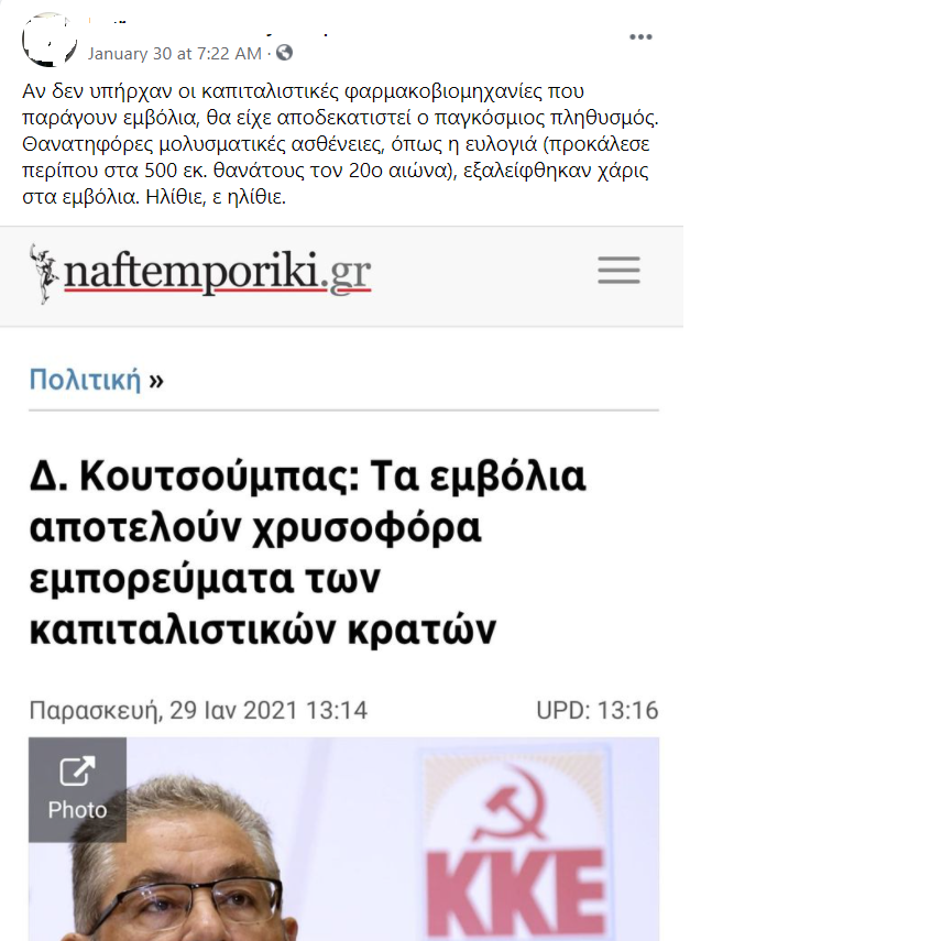 Εγώ έπεσα τυχαία, όχι μόνο μια φορά, σε αυτές τις θεωρίες: Αντίστοιχα διαβάζω και εδώ: Εμβόλια, καπιταλισμός και διεθνής συνεργασία WWW.CAPITAL.GR Η ανακάλυψη των εμβολίων για την αντιμετώπιση της πανδημίας σε διάστημα μικρότερο του ενός έτους, είναι ένα πραγματικό θαύμα της σύγχρονης επιστήμης. Και αναρρωτιέμαι, δεν τους έχει πει κανείς για το Sputnik, για το Sinovac και για το ότι η biontech ήταν μια κλασσική επιστημονική spinoff που ρούφαγε κυρίως κρατικό (ή έστω, ευρωπαϊκό / επιστημονικοεπιδοτήσεων) χρήμα? Για μένα είναι απαράδεκτο όταν έχει γονατίσει η παγκόσμια οικονομία να εξαρτάται η Δυτική Ευρώπη από το αν θέλει η Ρωσία να μας δώσει εμβόλια. Είναι ξεφτίλα.