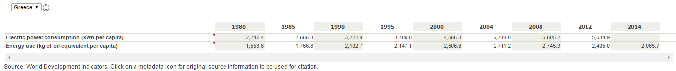 Έβαλα στο worldbank.org να δω για την Ελλάδα που έχει per capita κατανάλωση ενέργειας σε ισοδύναμο πετρελαίου και την actual μέση κατανάλωση σε ρεύμα. Επισυνάπτω τον Πίνακα, όπου φαίνεται τελείως διαφορετική εικόνα μεταξύ του άνωθεν γραφήματος και του δικού μου (διπλασιασμός ενεργειακών απαιτήσεων). Μπήκα στον κόπο επειδή με τα ελληνικά δεδομένα δεν μου φαίνεται λογικό να υπάρχει σταθερή κατανάλωση ενέργειας μεταξύ 1980 και 2016, όσον αφορά το per capita, και κάτι τέτοιο δείχνει στο Europe το "the atlantic" γράφημα παραπάνω.- 514 απαντήσεις