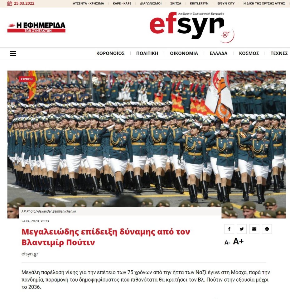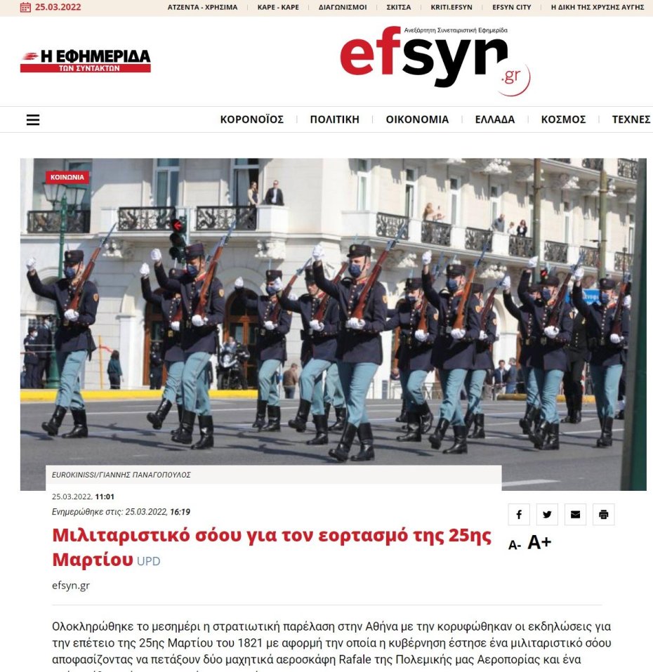 Σήμερα δεν είχαμε παρέλαση για την Εθνική μας Επέτειο. Εϊχαμε "μιλιταριστικό show" κατά την efsyn. Πριν δύο χρόνια, στη Ρωσία, είχαμε βέβαια "Mεγαλειώδη Επίδειξη Δύναμης", από τον φίλο μας τον Πούτιν. Για να διαπιστώνουμε μερικοί τι εστί, εχθρός εκ των έσω.