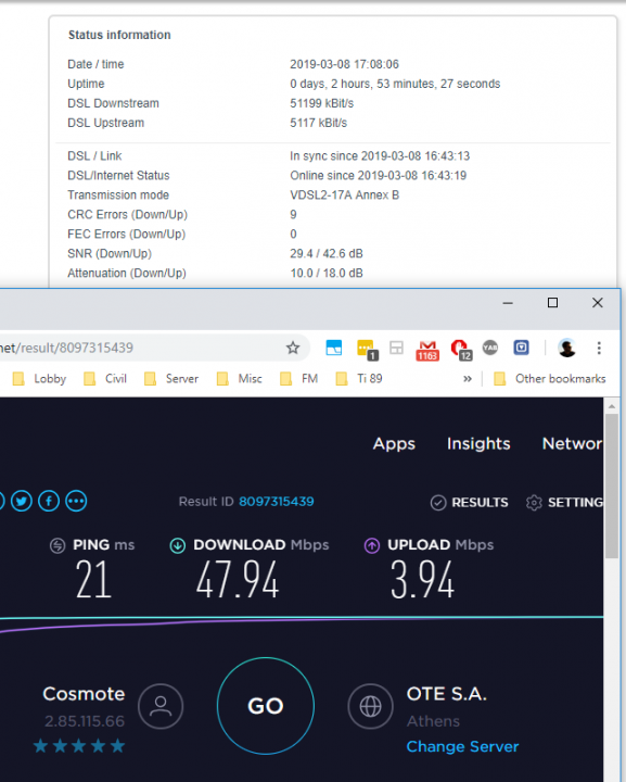 14. Έφτασε και η σειρά μου να ποσταρω σε αυτό το thread μετά από χρόνια υπομονής... ΟΤΕ 50αρα. Χωρίς να είναι καν διαθέσιμη στην περιοχή μου... μετά από ΟΚ τεχνικού. Από καφάο παίρνω που είναι σε απόσταση μισού οικοδομικού τετραγώνου. Φτου Φτου μέχρι στιγμής! Με το Speedport Plus πάνω από 3.2 Mbit Upload δεν... Με το που έκανε κλήση το Mikrotik ξεμπούκωσε (~4.70 στο SpeedTest) .
