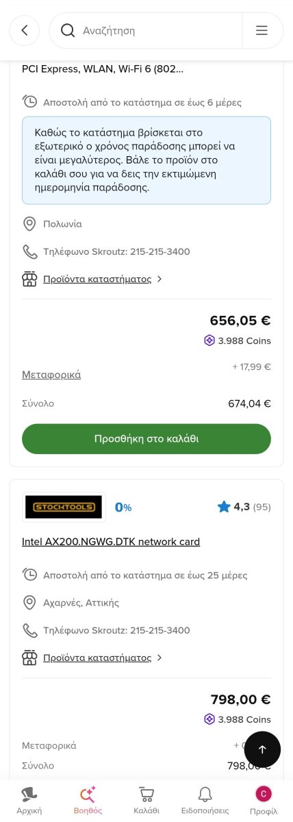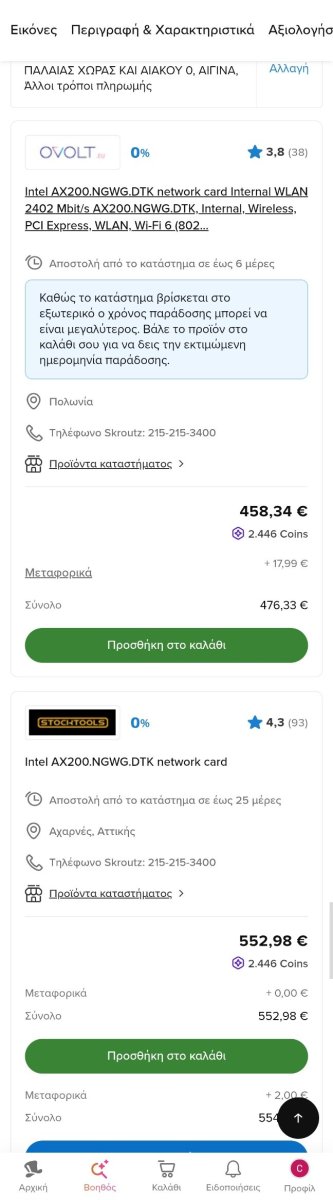 Ρε παιδιά τι έχει γίνει εδώ https://www.skroutz.gr/s/29390047/Intel-Gig-Desktop-Kit-AX200-M-2-2230-Asyrmati-Karta-Diktyou-Wi-Fi-6-2400Mbps-PCI-e.html?event_price=458.34 Απο 20 ευρώ έχει πάει 560? Τι έχει παιχτει εδώ ρε παιδιά. Το ίδιο κατάστημα ανέβαζε τιμή σιγά σιγά και κάνει όσο μια κάρτα γραφικών Έχω αγοράσει απλά μου σκάσει στις ειδοποιήσεις και κουφαθηκα
