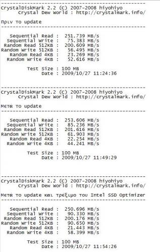 Μόλις έβαλα το νέο update στον 80άρη και έτρεξα και το Intel SSD optimizer. Έκανε δουλειά..... Πάντως η Intel πρέπει να έχει σίγουρα περιορισμένο επίτηδες το sequential write. EDIT: Ξέχασα να ανφέρω ότι πρόκειται για 80άρη σε απλό SATA.