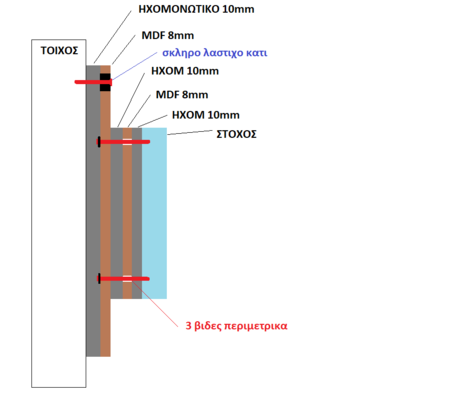 καλησπερα και ευχαριστω για τις απαντησεις. με λιγο ψαξιμο και στο νετ για παρομοιες καταστασεις, τελικα θα παω στη φιλοσοφια: ελεγα να σφιξουν λιγο οι 3 βιδες το στοχο με τα 2 mdf και 2 ηχομονωτικα, πισω απο το τελευταιο mdf παλι ηχομονωτικο κολλημενο, και ολο μαζι να κρεμεται απο τον τοιχο με μια μεγαλη βιδα/καρφι αλλα να παταει μεσω κατι σα σινεμπλοκ, και πισω στον τοιχο να βαλω και καμια διπλης οψης για να μη κουνιεται. αφορασα απο πρακτικερ πριν λιγο τα mdf και τα ηχομονωτικα.