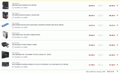 Ρε παιδιά, μ' αυτόν τον παραλογισμό δηλαδή "θέλω πιο αργό υπολογιστή για να κάνω οβερκλόκ και δε με νοιάζει αν με τα ίδια λεφτά μπορώ να πάρω πολύ πιο γρήγορο υπολογιστή με στοκ ρολόγια", τί να πω, μένω άφωνος - τί άφωνος δηλαδή, σόλωνος με τσακάλωφ γωνία μένω. Αλλά τέλος πάντωνε, επειδής το οβερ-τέτοιο έχει και μια ψυχολογία να πούμε, λέω το εξής: Όποιος έχει εφτάμισυ κατοστάρικα για υπολογιστή, σίγουρα μπορεί να δώσει οκτώ - μη συζητάμε τώρα για ένα πενηντάρι. Επομένως, αν σ' αυτά που προτείνω αλλάξει το mobo με συν 15€ και πάρει αυτό, άντε με συν 25€ αυτό που είναι πιο μουράτο, και δώσει και άλλα 20-25€ για ένα 600άρι τροφοδοτικό, και αντί αερόξυξης με συν 25€ πάρει και αυτήν εδώ, έχει λήξει το ζήτημα. Ποιο κουτί, ποιο headroom, τί μου λέτε τώρα! Δηλαδή, εφτάμισυ κατοστάρικα για να έχει απλώς i5; Έλεος... Αν, πάλι, δεν ξέρω τί λέω, οκ πάσο. Καλά να είναι το παιδί, να πάρει αυτό που θέλει και να το χαρεί. Κάνει και ζέστη σήμερα αφού...
