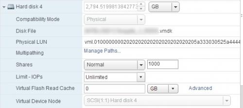 Επιβεβαιώνω ότι η τεχνική του RDM (αν και εντελώς unsupported επίσημα) λειτουργεί σωστά σε δίσκους μεγαλύτερους από 2ΤΒ σε ESXi 5.5 και 5.5 U1. Τόσο ο ESXi, όσο και το εικονικό μηχάνημα στο οποίο συνδέεται βλέπουν σωστά το μέγεθος του δίσκου και είναι ολόκληρος usable. Περισσότερα και εδώ. Και για του λόγου το αληθές: