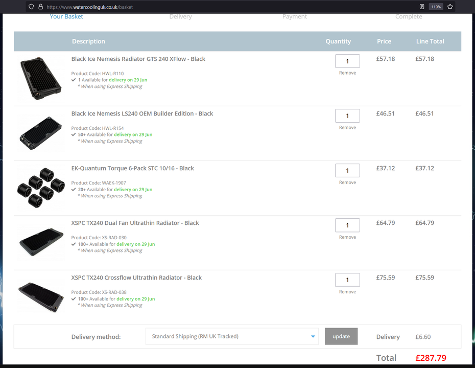 Θα κοιταξω λιγο πως θα βαλω τα fans κ θα δω ποιο σεναριο δουλευει καλυτερα. Ισως τα XSPC να βολευουν καλυτερα αλλα εδω στην Αγγλια ειναι ακριβοτερα απο τα υπολοιπα. (οχι σημαντικη διαφορα αλλα σε ολα τα καταστηματα υπαρχει διαφορα οπως η παρακατω) Το βαρος δε μπορω να το αντιμετωπισω απο τη στιγμη που ειμαι σε ~mATX μεγεθους κουτι με δυο ψυγεια κ reservoir. Αν δουλευε με ενα 240 χωρις res, μονο με pump block (οπως της Barrow που ειχα πριν), οκ. Αλλα δε δουλευει με 3700Χ κ 2080Ti. Ποσο μαλλον οταν αλλαξω σε 5800Χ κ 3080. ΥΓ. στο κουτι της υπογραφης μπορω να βαλω κ τριτο 240 ψυγειο, κατω απο την καρτα γραφικων. Εκει το ειχα μεχρι τωρα το SE γιατι δε χωρουσε να μπει διπλα στο XSPC λογω παχους αυτου. Απλα τα fans που ειχα πανω του, ηταν 2 Noctua 12x15 Chromax τα οποια δε κανουν τιποτα καθως ειναι 1-2 χιλιοστα μακρια απο το gpu block. Ουσιαστικα το ψυγειο αυτο, μεχρι τωρα, λειτουργουσε σαν res παρα σαν rad. -