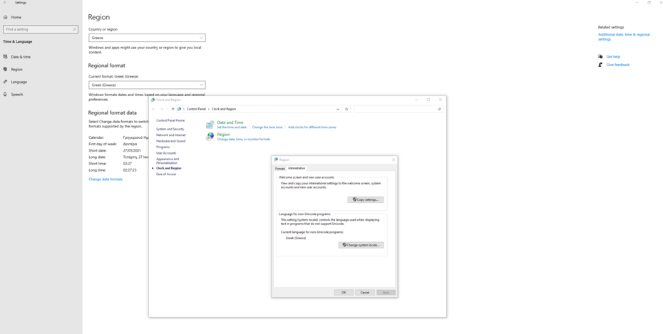 Control Panel Time & Language Region Πάτα από δεξία "Additional Date & Time Settings" Πάτα στο Region Στη δεύτερη καρτέλα "Administrative" Στη δεύτερη επιλογή, γράφει Locale Greece; Αν όχι, κάντο Ελληνικά -