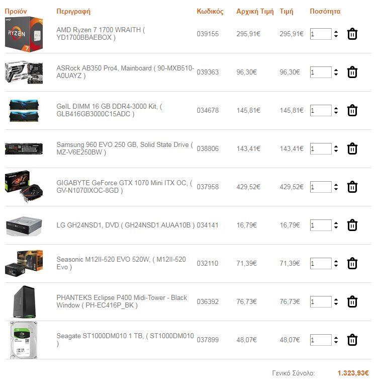 Από digitalmaster.gr -Δωρεάν μεταφορικά -3% έκπτωση σε φοιτητές -1 παιχνίδι δώρο -δωρεάν συναρμολόγηση. -Ενα κλειδί WINDOWS 10 PRO δώρο. AMD R7 1700 NVME ΔΙΣΚΟΣ 1TB HDD 16Gb ddr4 3000Mhz CL16 GTX 1070 8GB DDR5 κάρτα SEASONIC 520 τροφοδοτικό εγγύηση. https://seasonic.com/product/m12ii-520-evo/ Το κουτί που διάλεξες . Μητρική με 2X M2 για δεύτερο M2 ssd (pci-e x2), επαρκέστατο VRM για τον R7 1700, USB Type C στο backpanel . http://www.asrock.com/mb/AMD/AB350 Pro4/ Εναλλακτικά μπορείς να πας σε PATRIOT HELLFIRE NVME 240GB που είναι φτηνότερος http://www.digital-master.gr/el-gr/Products/240GB|Patriot Hellfire M.2 240GB- Solid State Drive ( PH240GPM280S και να βάλει καλύτερη υλοποίηση της GTX 1070 http://www.digital-master.gr/el-gr/Products/nVidia 1070|Gainward GeForce GTX 1070- ( 3750 ) http://www.digital-master.gr/el-gr/Products/nVidia 1070|MSI GeForce GTX 1070 ARMOR 8G OC- ( V330-003R ) Εναλλακτικά τροφοδοτικό https://www.skroutz.gr/s/12518015/Seasonic-Focus-Plus-550-Gold.html https://www.skroutz.gr/s/2579244/FSP-Fortron-Raider-550W.html -