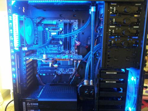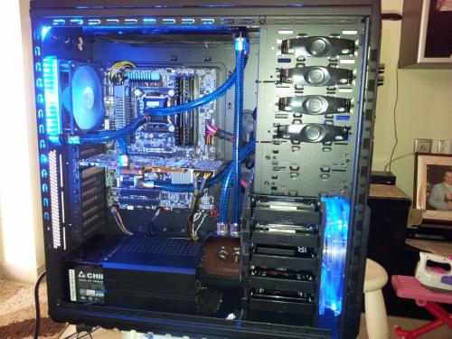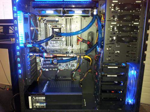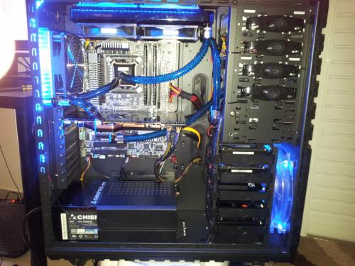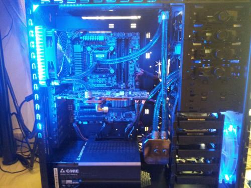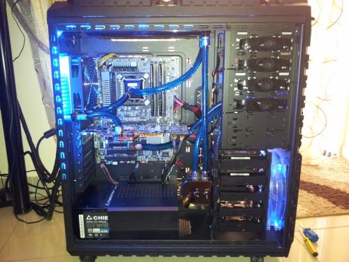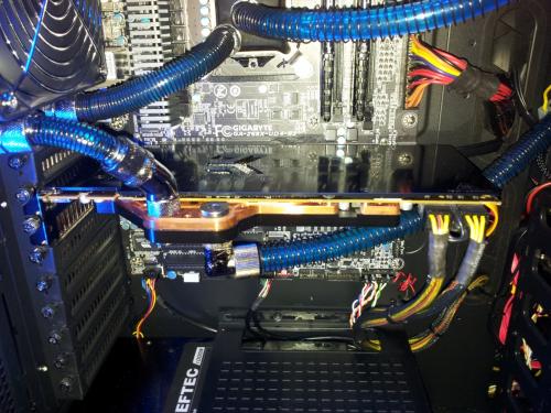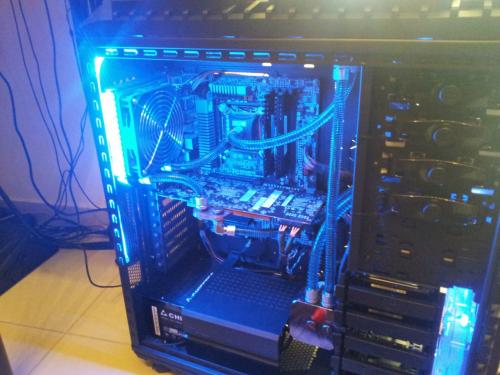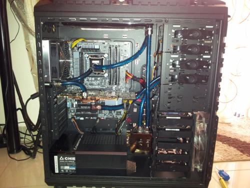 Rebuild v.2 Eιπα να προλαβω τις ζεστες και εκανα μερικες αλλαγες,στο πανω ψυγειο μπηκαν 4 φαν push pull η αντλια εφυγε απο εκει που την ειχα και μπηκε στην θεση της,οπως επισης εφυγε το μπλοκ της 7970 (Alphacool nexxos) λογω αστοχιας υλικου (RMA)και αντικατασταθηκε με EK waterblock full cover acetal μαζι με backblade η επιχειρηση αλλαγης κρατησε 2 ημερες με μια μικρη απωλεια το χαλι του Σαλονιου οπου επεσε λιγο ΥΓΡΟ...:hehe:
