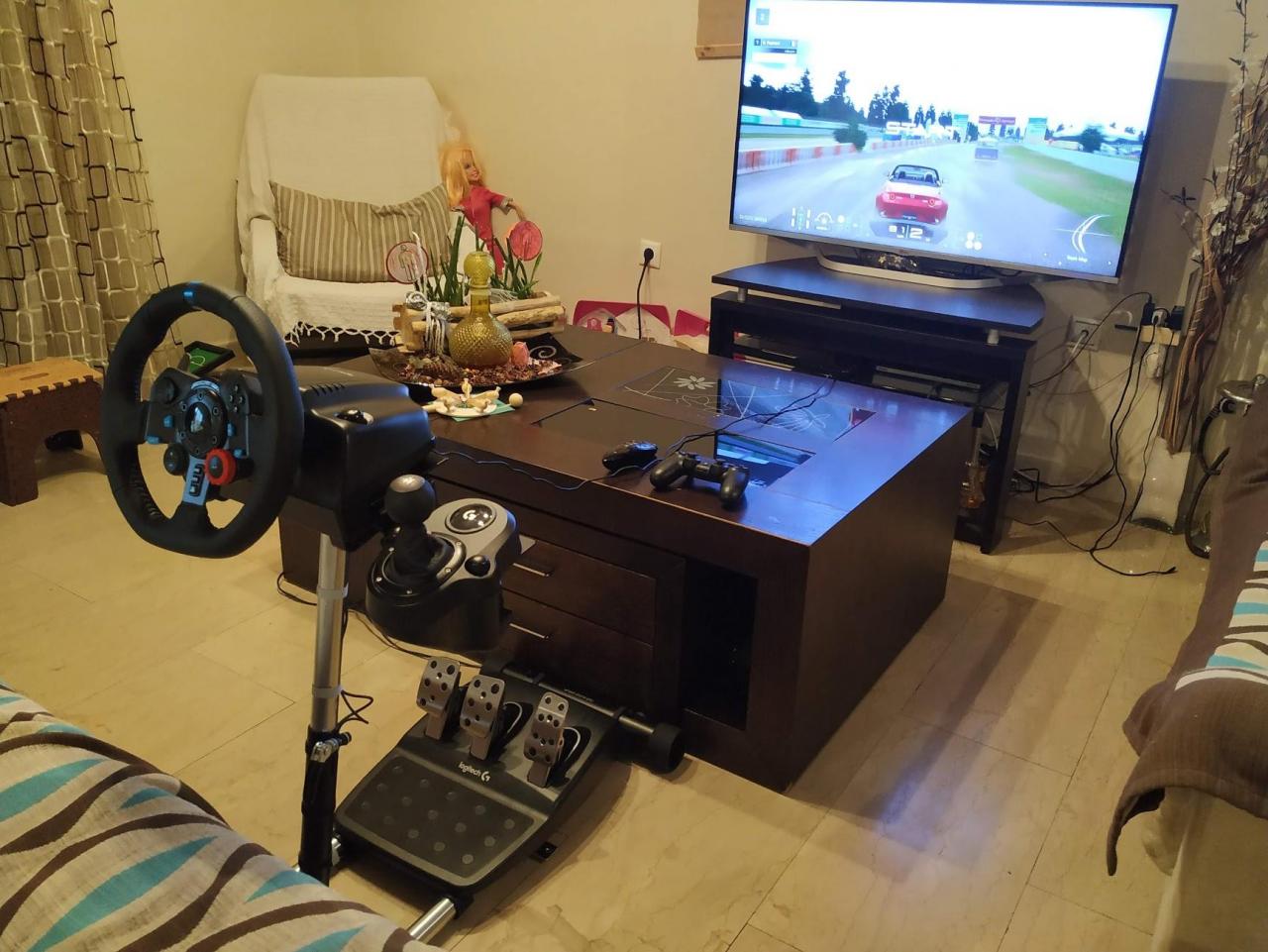 5. Για να κλείσει το θέμα είπα να ενημερώσω για όποιον άλλον ενδιαφερθεί. Τελικά πείρα το Wheel stand pro deluxe v2 και μπορώ να πω ότι το έχω κατα ευχαριστηθεί. Είναι πάρα πολύ στιβαρό και έχει πολύ premium αίσθηση σαν κατασκευή. Στην περίπτωση μου υπάρχει και ένα αρκετά βαρύ τραπέζι σαλονιού μπροστά του, που αποκλείει και την όποια μετακίνηση σε κάποια βίαια πατήματα όπως φαίνεται στην εικόνα παρακάτω αν και δεν νομίζω ότι θα είχε θέμα γενικότερα. Ο φόβος μου μήπως δεν σφίγγει σωστά και κουνιέται κτλ έφυγε από την πρώτη κιόλας χρήση. Ευχαριστώ πολύ τους φίλους που ασχολήθηκαν γιατί πήγαινα τελείως τυφλά όντας "νουμπάς" φουλ με το αντικείμενο.. Και ιδιαίτερα τον @Aris Teidis που μου έδωσε πολύτιμες πληροφορίες και κατεύθυνση. Edit: Για όποιον ίσως ενδιαφερθεί να ενημερώσω πως η αντιπροσωπεία στην Ελλάδα της Wheel Stand δεν έχει απόθεμα και έτσι όπως μου τα είπαν μάλλον δεν θα ξανά ασχοληθούν, από ebay την έβρισκα γενικά ακριβότερα λόγο μεταφορικών ενώ απευθείας από την εταιρεία βγαίνει 125€ χωρίς επιπλέον κόστος μεταφορικών και φυσικά επειδή είναι ευρωπαϊκή εταιρεία δεν έχει δασμούς τελωνεία κτλ... Ο χρόνος παράδοσης είναι 5-7 εργάσιμες με UPS.
