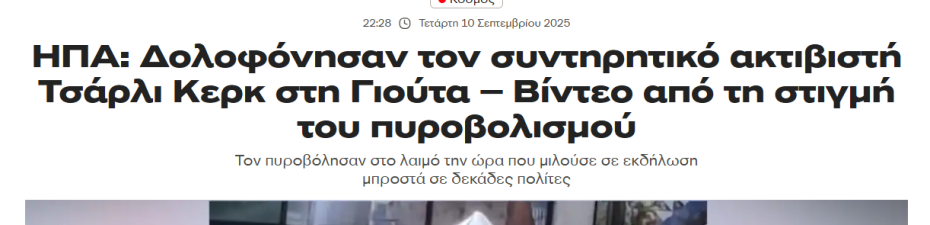 Ναι, αλλά το ακροδεξιός δεν είναι βρισιά, είναι πολιτικός χαρακτηρισμός. Δεν είναι το ίδιο με το κομμούνι που είναι ξεκάθαρα μειωτικός όρος. Aυτό γενικά όχι για τον τύπο που δολοφονήθηκε ειδικά. Ο οποίος δεν θα έλεγα ότι ήταν ακροδεξιός με την λογική της ακροδεξιάς στην αμερική (white pride κλπ). MAGA φάση ήταν που όμως φλέρταρε με τα πιο hardcore ακροατήρια και αν γίνουμε αυστηροί θα λέγαμε πως ήταν το getaway drug προς τις πιο ακραίες ιδεολογίες. Kαι φυσικά ο τίτλος διορθώθηκε αφού έκανε το clickbait έργο του. Κλασική ελληνική δημοσιογραφία. ΗΠΑ: Δολοφόνησαν τον συντηρητικό ακτιβιστή Τσάρλι Κερκ στη Γιούτα - Βίντεο από τη στιγμή του πυροβολισμού WWW.NEWSIT.GR Τον πυροβόλησαν στο λαιμό την ώρα που μιλούσε σε εκδήλωση μπροστά σε δεκάδες πολίτες -