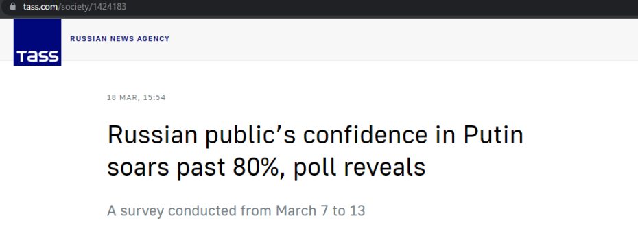 Αν αναφερόμουν σε σένα συγκεκριμένα θα σε έκανα quote ή mention. Δεν συμφωνώ απόλυτα με την προσέγγισή σου στο φιλορωσικό ζήτημα αλλά δεν έχω σκοπό να σου προσδώσω σατανική υπόσταση όπως λες. Δεν έχει κάποιο νόημα για μένα αυτό. Κουβέντα (προσπαθούμε, συνήθως, οι περισσότεροι) να κάνουμε όχι να βριστούμε και να πετάξουμε προσβολές κλπ. Περι quotes, Στο πρώτο απαντάω σε άλλον συμφορουμίτη και στο δευτερο αν δεις προς το τελος έχω μια εικόνα με την δημοτικότητα του Πούτιν στη Ρωσία. O λαός που υπηρετεί στον στρατό και λεηλατεί/βιάζει και κλέβει μέχρι και μεταχειρισμένες μάσκαρες είναι ο ίδιος λαός που στηρίζει τον Πούτιν. Γι αυτούς μια τέτοια συμπεριφορά είναι αποδεκτή και δεν ξεφεύγει από το πλαίσιο του Ρωσικού μαξιμαλισμού με τον οποίο γαλουχήθηκαν.