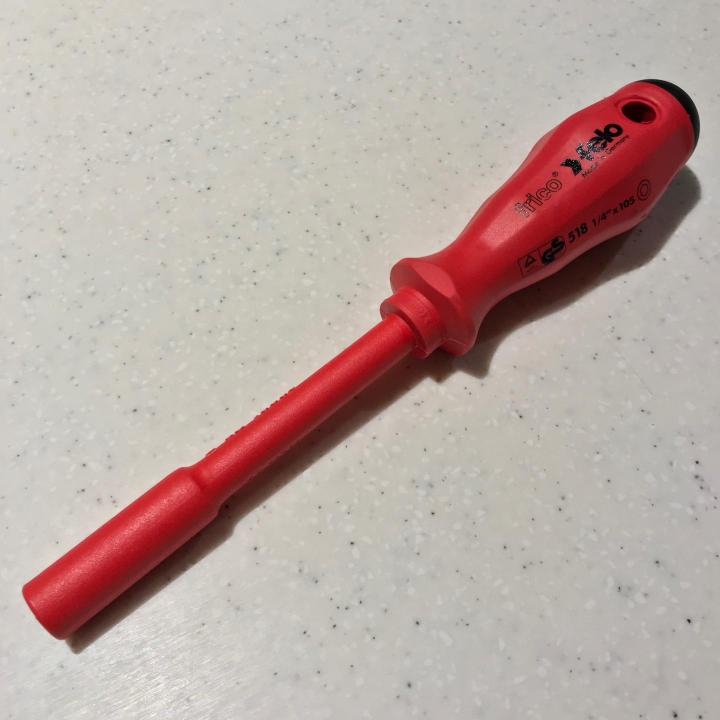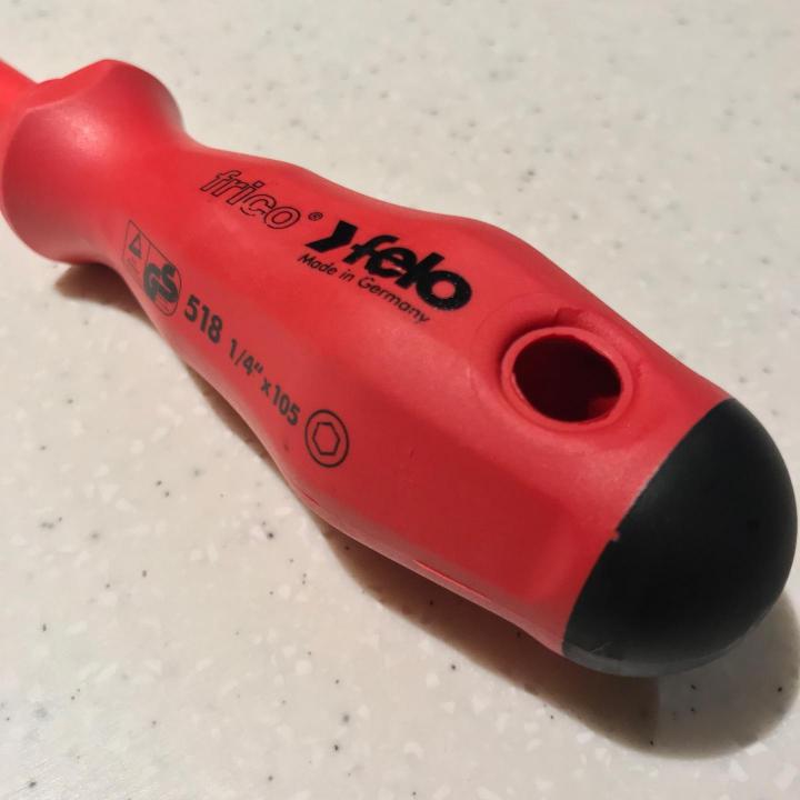 Κατσαβίδι της Felo με υποδοχή για μύτες 1/4 και ηλεκτρική μόνωση. Felo 0715750785 1/4-Inch x 4-Inch Insulated Hex Bit Holder Screwdriver, 518 Series Η λαβή είναι μαλακή,με πολύ καλό κράτημα και πολύ βολική.Το υπόλοιπο είναι από πιο σκληρό πλαστικό και δείχνει ιδιαίτερα ανθεκτικό. Ο μαγνήτης καλός,όπως πρέπει σε δύναμη. Μερικοί γράφουν στο νετ ότι είναι υπερβολικά δυνατός και δεν βγαίνει η μύτη εύκολα,αλλά μάλλον θα έτυχε. Γενικά είναι εργαλείο πολύ χρήσιμο γιατί σου δίνει την δυνατότητα να έχεις πάρα πολλές επιλογές στην χρήση του. Το μόνο ίσως μείον είναι ότι είναι 13mm,λόγο του αντάπτορα μπροστά και σίγουρα δεν μπαίνει σε στενά μέρη.- 2.258 απαντήσεις