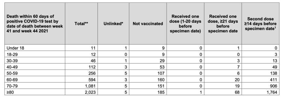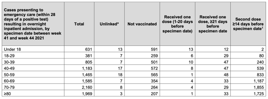 https://assets.publishing.service.gov.uk/government/uploads/system/uploads/attachment_data/file/1032859/Vaccine_surveillance_report_-_week_45.pdf Στην Αγγλία έχει εμβολιαστεί το 61%. Ο παρακάτω πίνακας δείχνει τα περιστατικά covid που εντός 28 ημερών από θετικό τεστ χρειάστηκε να κάνουν τουλάχιστον μια διανυκτέρευση στο νοσοκομείο. Για όσους δεν ξέρουν καλά αγγλικά, οι στήλες είναι: Ηλικία - Σύνολο - Άγνωστο αν είναι εμβολιαστμένος - μη εμβολιασμένος - εμβολιασμένος με μία δόση - εμβολιασμένος με δύο δόσεις αλλά δεν έχουν περάσει 21 μέρες από την δεύτερη δόση - πλήρως εμβολιασμένος Ο επόμενος πίνακας δείχνει τα περιστατικά που εντός 60 ημερών από το θετικό τεστ πέθαναν.