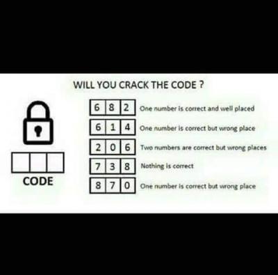 -γραμμή 4:λάθος οι 7-3-8 -λόγω γραμμής 1 & 2, απορρίπτεται το 6:δε μπορεί να είναι σωστό, και ταυτόχρονα σε σωστή και λάθος θέση. -στη γραμμή 1, λόγω του ότι έχουμε απορρίψει 6 και 8, μένει το 2, και μάλιστα σε σωστή θέση. Τρίτο. -γραμμή 3:δύο αριθμοί σωστοί, σε λάθος θέση. Άρα, από τα προηγούμενα, το 0 πάει πρώτο (το επιβεβαιώνει το 0 πως είναι σωστός αριθμός αλλά σε λάθος θέση καί η γραμμή 5), και το 2 τρίτο. -μένει ο μεσαίος αριθμός, που θα τον δώσει η γραμμή 2. Ανάμεσα σε 1 και 4, ένας είναι σωστός, αλλά σε λάθος θέση. Το 1 απορρίπτεται, διότι δεν μπορεί να πάει πρώτος ή τρίτος. Άρα, ο 4 είναι ο σωστός. Και η θέση του είναι λάθος, λόγω του ότι είναι σε λάθος θέση, όπως αναφέρει και η γραμμή. Άρα, η μόνη θέση που του μένει είναι η μεσαία. 0-4-2.- 5.691 απαντήσεις