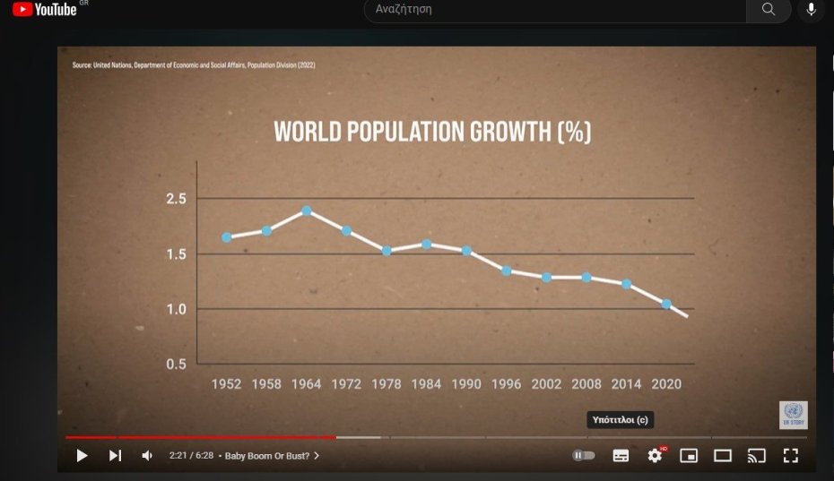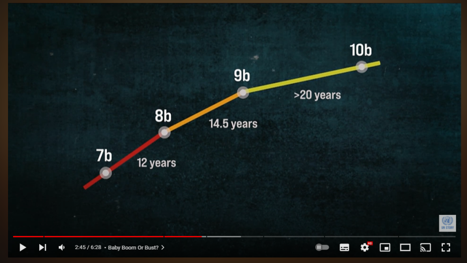 Στο άρθρο υπάρχει και ένα βιντεάκι που λέει ότι η τάση αύξησης του πληθυσμού δείχνει σημεία επιβράδυνσης. Επίσης υπολογίζει ότι για κάθε αύξηση του πληθυσμού κατά ένα δισεκατομμύριο θα απαιτείται μεγαλύτερο χρονικό διάστημα από την προηγούμενη. Λέει και άλλα για την γήρανση του πληθυσμού, τη μείωση στις γεννήσεις κλπ. Το βίντεο εδώ.