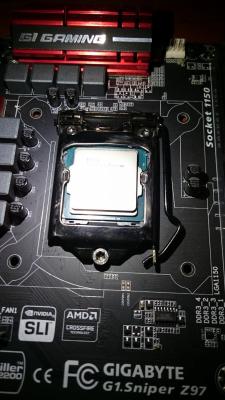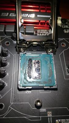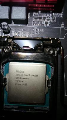 εδω ο ασθενης μετα την επεμβαση μετα απο χθεσινο λιωσιμο του κολλητου οι θερμοκρασιες ειναι στους 12 βαθμους κατω η gigabyte περιμενει υπομονετικα................................... και η υπομονη της ανταμείβεται............... εδω φαίνεται και η μονωση που θελει εσωτερικα ο 4790Κ.......... Χωρις μονωση ουτε για πλακα αγωγιμη παστα μεσα........ -