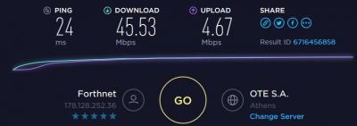 Ενεργοποιήθηκα τελικά εχθές. Από ftp της forthnet βλέπω από 4.6 έως 5.1 και από nvidia από 4.9 έως 5.2(mb/s). Το ping στο cs από το λίγο που έιδα δεν άλλαξε. Παρακάτω είναι τα στατιστικά μου και ένα speedtest. -