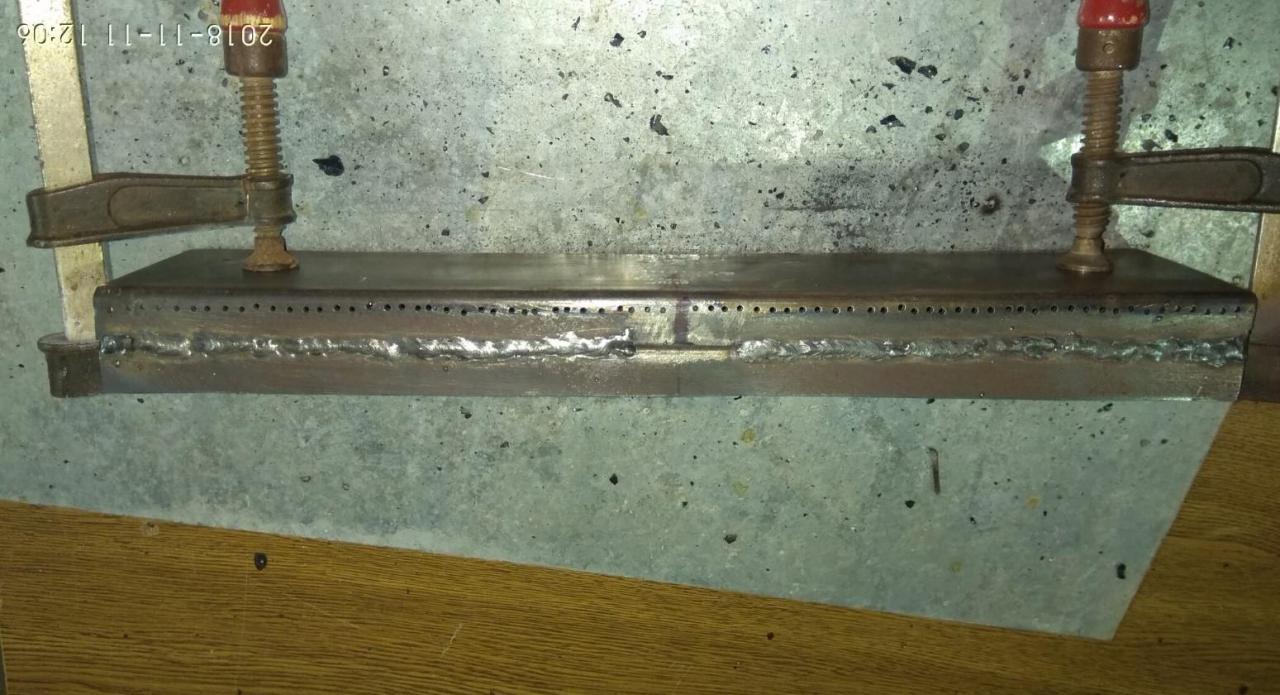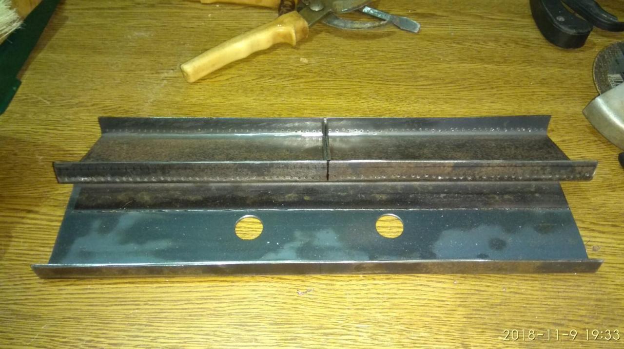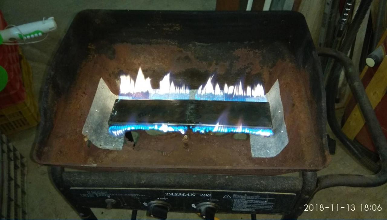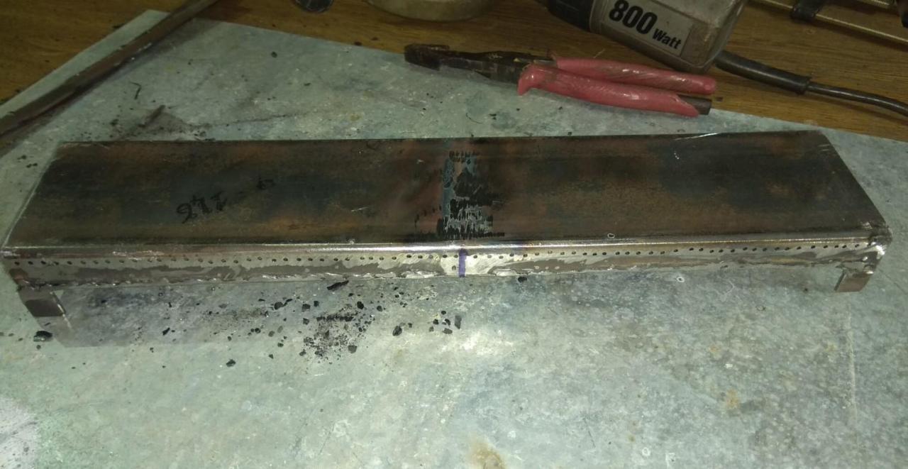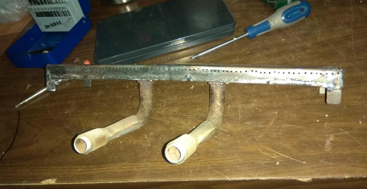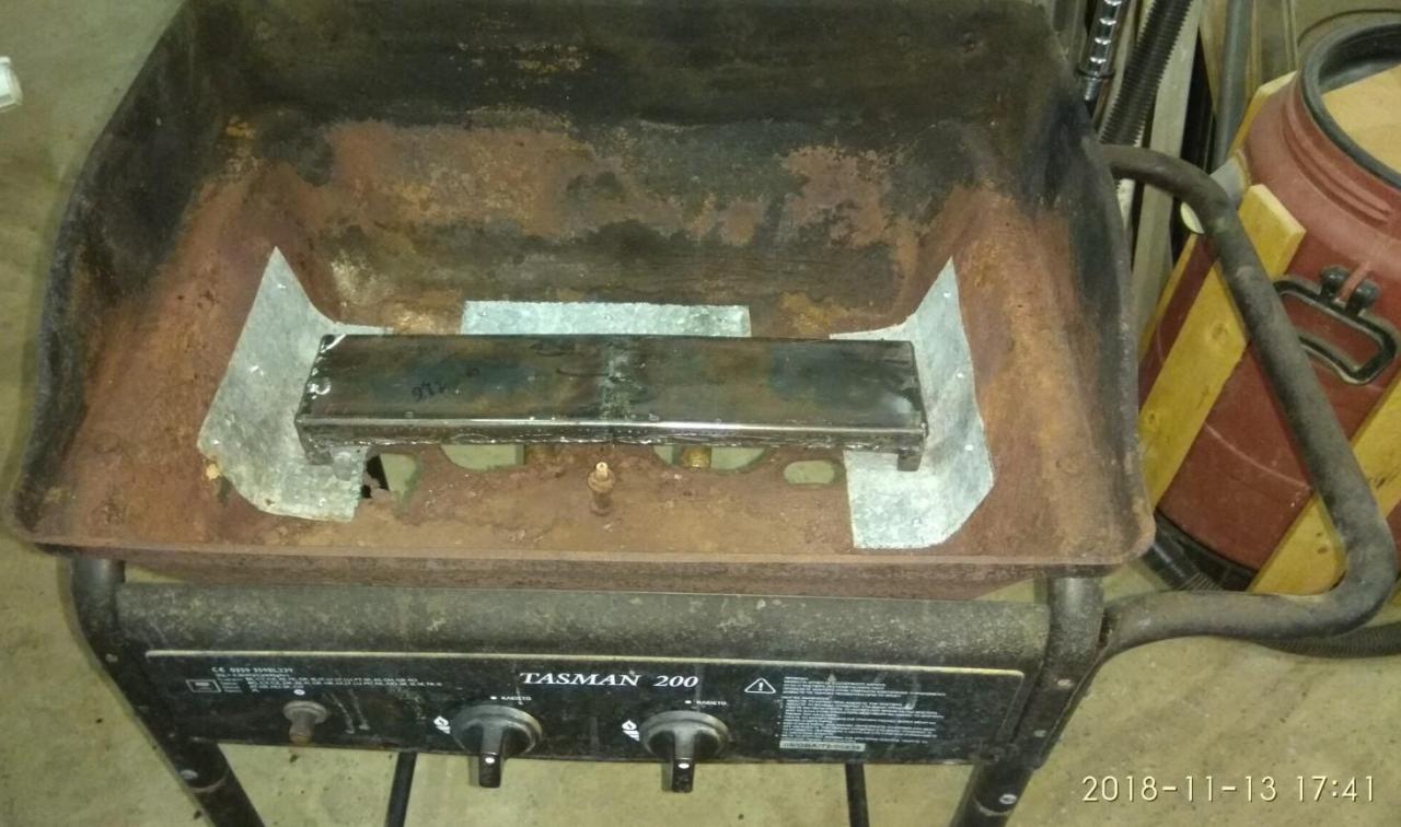 Καλήμερα ! Μιας και η αμερικανιά μας είναι σε προχωρημένο στάδιο και ψήνουμε και σε υγραέριο πλέον ένας ανταλλακτικος καυστήρας για μια απλή ψησταριά υγραερίου κοστίζει 50+ ευρώ ! έγινε ιδιοκατασκευη με μηδενικό κόστος για μια απλή ψησταριά φίλου που πνέει τα λοίσθια (η ψησταριά όχι ο φίλος) Έχει αρχίσει και σαπίζει στην κάτω μεριά... Ποιο πολύ έγινε ένα τεστ για την κατασκευή του καυστήρα - πόσο καλά δουλεύει και σε επόμενο στάδιο θα φτιαχτεί ίσως εξολοκλήρου μια νέα ψησταριά ''αθάνατη'' έτσι κάπως ήταν... έτσι επόδωκε... έλιωσε τελείως το πάνω καπάκι του καυστήρα! έψαξα στα ρετάλια , βρήκα ένα κομματι στρατζαριστο 80χ40mm που ήταν ίδιες διαστάσεις με τον καυστήρα στο πλάτος αλλά διπλάσιος στο ύψος (40mm) κόπηκε στη μέση και έγινε 20mm... μετρήθηκαν τρύπες , διατομές , σημαδεύτηκε το στρατζαριστό... Άρχισε το κολλημα , μπήκε και μια λάμα σαν χώρισμα στην μέση του νέου καυστήρα για να γίνει στην ουσία δυο ''μάτια'' ο καυστήρας (οπως ο παλιός) Μπήκαν τα πλαινα καπάκια , ανοίχτηκαν πάσα Μ5 για να βιδωθούν οι σωλήνες εισαγωγής... ενισχύθηκε ο πάτος της ψησταριάς με λαμαρίνα για όσο την βγάλει ακόμα... Μπήκε πάνω ο καυστήρας και δοκιμάστηκε.... Υπήρξε σκέψη για το ποσες τρύπες να ανοιχτούν στον καυστήρα για να είναι ''σωστή'' η φλόγα... έγινε και δοκιμή με μπριζολάκια και τώρα έχει καλύτερη κατανομή η φωτιά... πριν πίσω και μπροστα είχε λιγότερη φωτιά! Μπριζολάκι καλό ... όλα καλά !!!