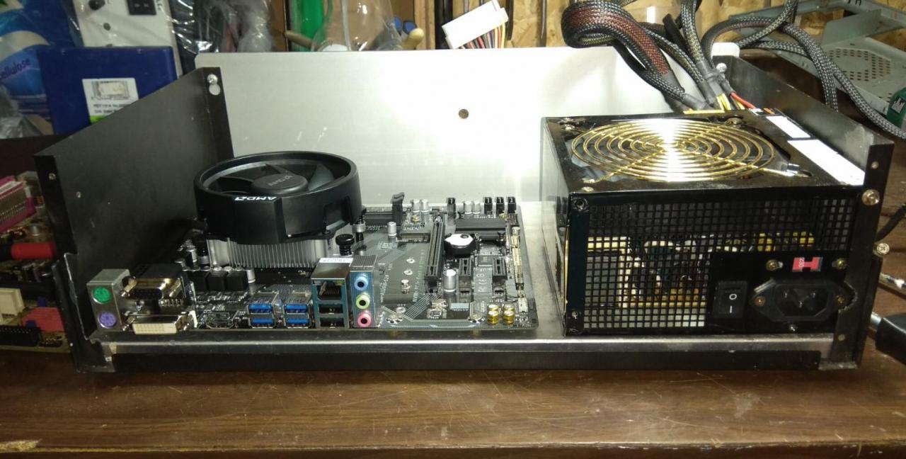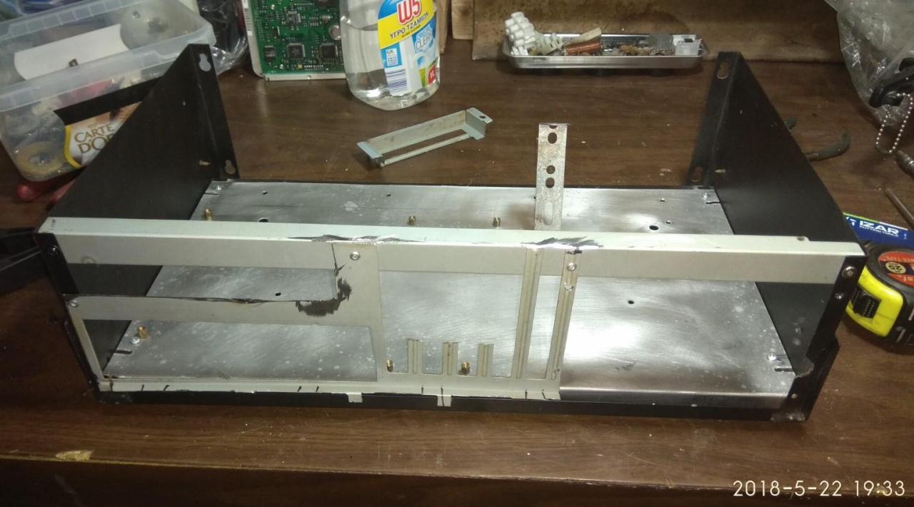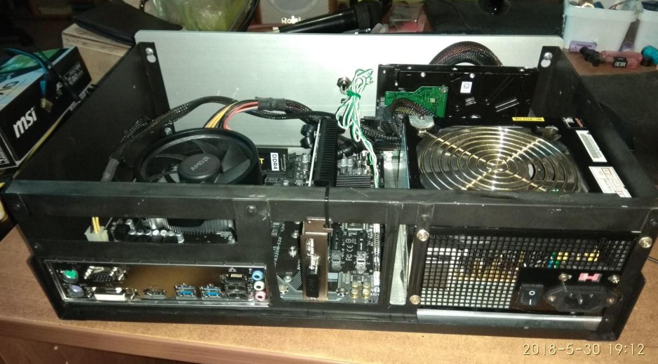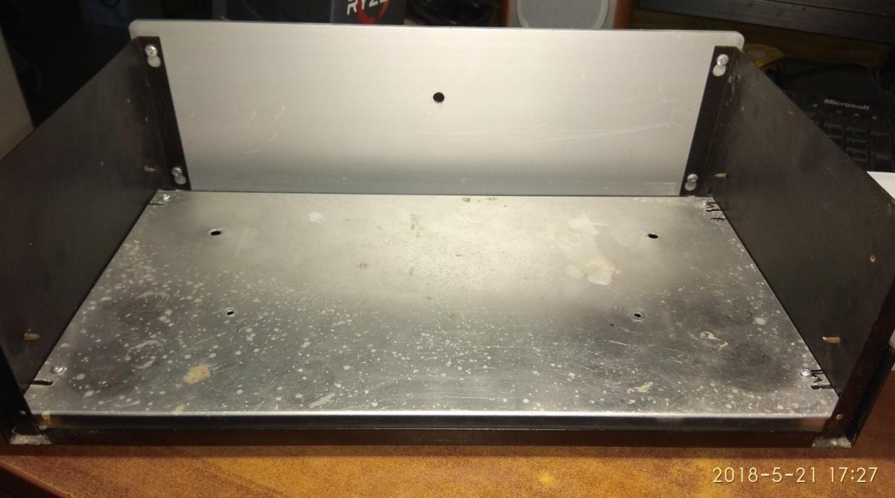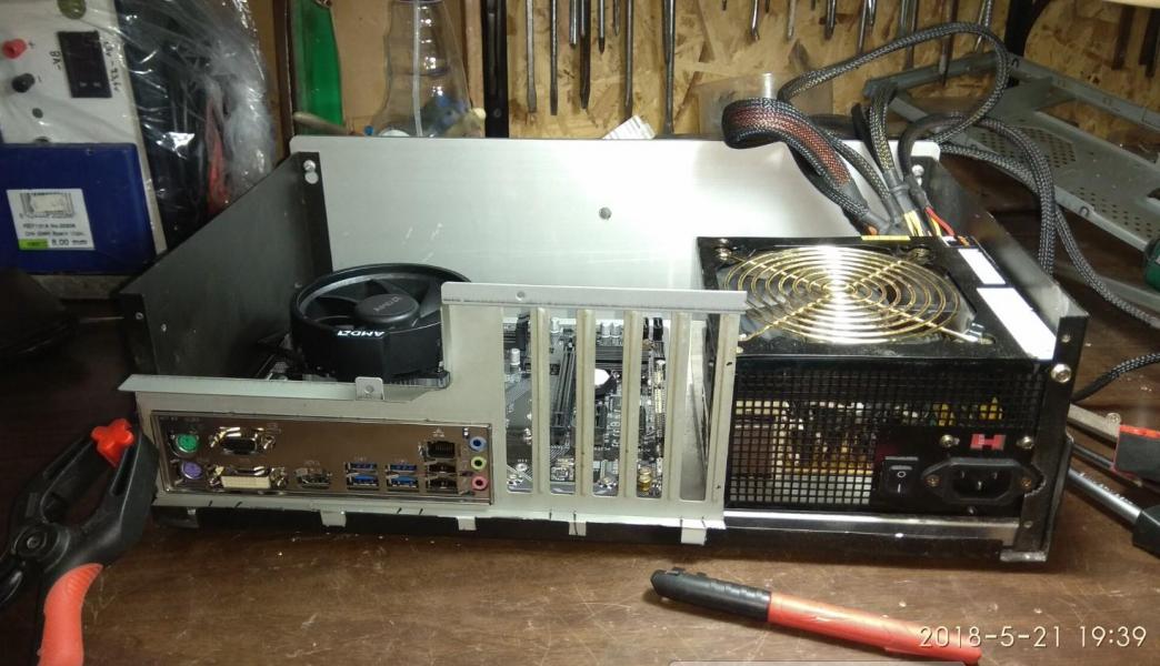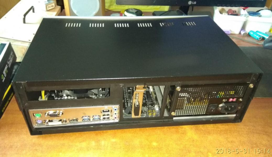 PC CASE από παλιό κουτί κατασκευών και τα βρισκούμενα για φίλο! mobo micro ATX + CPU + memory αγοράστηκαν το κάτω καπάκι γυρίστηκε αντίστροφα για να είναι οι γρίλιες εισαγωγής αέρα μπροστα Η αλουμινένια βάση στήριξης μεταφέρθηκε λίγο πιο πίσω έγιναν πρόβες τρύπημα και πάσα για τους αποστάτες που είναι από παλιά κουτιά υπολογιστών μετά ξύσιμο κεφαλιού για το πως θα γίνει η πίσω μεριά άρχισε το ράβε - ξήλωνε από παλιό κουτί υπολογιστή βάψιμο εδώ έγιναν τρύπες για σκληρούς δίσκους (μέχρι 3) και καποια κοψίματα για τον αερισμό εξτρά πέμπτο πόδι κάτω και λάστιχα να πατάει καλά η αλουμινένια βάση στο κάτω καπάκι power button & power led σχεδόν έτοιμο πίσω εκεί που είναι η κάρτα γραφικών το προόριζα για ανεμιστήρα 8cm γιατί νόμιζα ότι θα είναι onboard η κάρτα γραφικών δεν θεώρησα αναγκαίο να κλειστούν τα κενά με καποια διάτρητη λαμαρίνα ή σίτα αργότερα βλέπουμε... μπήκαν λειτουργικό κλπ και τώρα εκτελεί χρέη μουσικής πηγής & ταινιών στο καθιστικό του φίλου μου Βασίλη