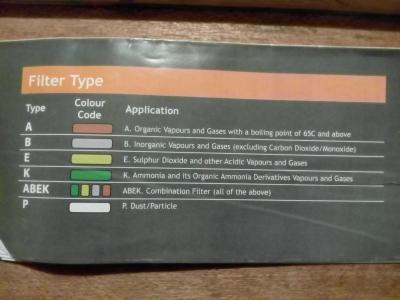 Τύπος AΕφαρμογή: Α.Ατμοί Οργανικής και αέρια με σημείοβρασμού 65C και άνωΤύπος BΕφαρμογή: Β. Ατμοί Ανόργανης και αέρια (εκτός απόδιοξείδιο του άνθρακα / Μονοξείδιο)Τύπος EΕφαρμογή: Ε. Διοξείδιο του θείου και άλλα όξινα αέριακαι ατμοίΤύπος KΕφαρμογή: Κ. Αμμωνία και οργανικά παράγωγα τηςαμμωνίας Οι ατμοί και τα αέρια τουΤύπος ABEKΕφαρμογή: ABEK. Συνδυασμός φίλτρου (όλα ταπαραπάνω)Τύπος PΕφαρμογή: Π. σκόνης / Σωματιδίων Είναι (αν δεν κάνω λάθος...) συνδυασμός τύπου Α (καφέ) και Ρ (λευκό)- 2.258 απαντήσεις