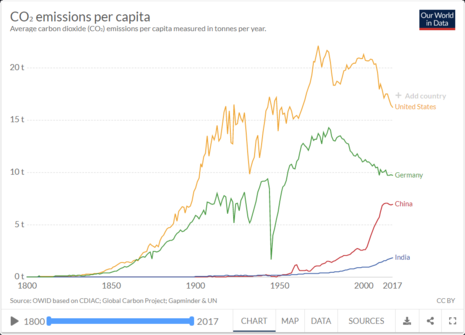 24. Στις προηγούμενες σελίδες θεωρώ ότι έχουμε αρκετές αναφορές σε πρωτογενείς πηγές για να καταλάβει οποιοσδήποτε καλόπιστος ότι ο τίτλος και το συμπέρασμα από το άρθρο είναι υποκριτικά και ψευδή. Ας πούμε, το σκεπτικό "η παιδική θνησιμότητα μειώνεται όσο οι εκπομπές CO2 αυξάνονται" είναι επιπέδου "ο αστυφύλακας και το μπουζούκι είναι όργανα". Ο αρθρογράφος τρώγεται να ισχυριστεί ότι ο αστυφύλακας είναι μπουζούκι, αλλά προφανώς αρκείται αν το κάνουν οι θιασώτες του. Είναι προφανές ότι -αντίθετα- οι εκπομπές CO2 είναι κι οι ίδιες αιτία νοσηρότητας και η συμμεταβολή δεν συνεπάγεται αιτιακή σχέση. Όμως, θα μείνω στην ουσία. Δυσανάλογη ευθύνη για την κλιματική αλλαγή έχουν οι ανεπτυγμένες χώρες. Αυτό σημαίνει ότι έχουν και δυσανάλογα μεγάλη υποχρέωση να δράσουν για να μετριάσουν τις συνέπειές της στον αναπτυσσόμενο κόσμο, αλλά και να οδηγήσουν σε ένα οικονομικά βιώσιμο μοντέλο ανάπτυξης που να μην επαναλαμβάνει τα λάθη του παρελθόντος. Δεν ξέρω σε ποιους θεωρείτε ότι απευθύνεται η συμπαθής (?) Γκρέτα, αλλά εμένα μου φαίνεται προφανές ότι απευθύνεται σε αυτές τις χώρες. Συνοψίζω γνωστές πληροφορίες: • οι υψηλότερες αθροιστικές εκπομπές CO2 και οι υψηλότερες κατά κεφαλήν εκπομπές οφείλονται συντριπτικά στις ανεπτυγμένες χώρες (ενδεικτικά, οι ΗΠΑ υπεύθυνες για το 25% του συνόλου όλων των εποχών) • το 40% των εκπομπών CO2 οφείλεται στην καύση άνθρακα και το 35% στην καύση πετρελαίου • το 50% των εκπομπών CO2 προκύπτει από καύσεις για θέρμανση και ηλεκτροπαραγωγή, το 20% από τον τομέα των μεταφορών • η ηλεκτροπαραγωγή από ΑΠΕ είναι πια φθηνότερη από αρκετές συμβατικές μεθόδους, ακόμη και χωρίς επιδότηση ή περιβαλλοντικό φόρο Συνεπώς, διαγράφεται μια πολύ βολική τροχιά, ώστε: • ο ανεπτυγμένος κόσμος να αναλάβει την ευθύνη που του αναλογεί, μειώνοντας δραστικά τις κατά κεφαλήν εκπομπές, χωρίς να θυσιαστεί η ανάπτυξη ή η ευημερία • ο αναπτυσσόμενος κόσμος να συνεχίσει να απολαμβάνει τα οφέλη της οικονομικής μεγέθυνσης, με μειωμένο τοπικό και παγκόσμιο περιβαλλοντικό αποτύπωμα και αυξημένη προστιθέμενη αξία από την επένδυση σε τεχνολογίες αιχμής (πχ ηλεκτροπαραγωγή, αποθήκευση ενέργειας) Για να μην επαναλάβω τις προηγούμενες σελίδες, αφήνω μια εξαιρετική σύνοψη για τις παγκόσμιες εκπομπές αερίων του θερμοκηπίου (σχεδόν όλα τα γραφήματα είναι δυναμικά) : https://ourworldindata.org/co2-and-other-greenhouse-gas-emissions και μια γλαφυρή σύνοψη των χωρών που έχουν απολαύσει την επιπόλαιη ανάπτυξη του παρελθόντος και μπορούν εύκολα να δώσουν το παράδειγμα για να αλλάξει το παραδοσιακό μοντέλο ανάπτυξη=ρύπανση: