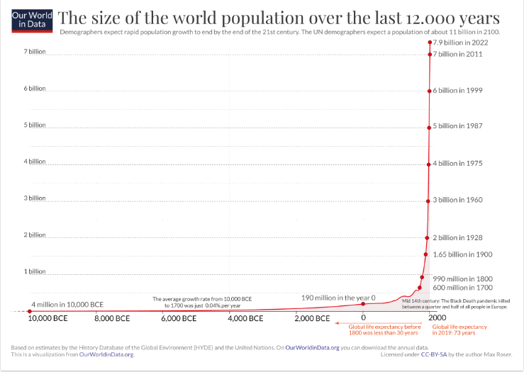 Από 3 δισεκατομμύρια το 1960. Όμως σκέψου ότι ~20 στα 100 παιδιά που γεννιούνται φέτος είναι στην Ινδία και ~10 στα 100 είναι στην Κίνα. Συνολικά, 50 στα 100 γεννιούνται στην Ασία, ενώ μόλις 5 στα 100 στην Ευρώπη και 10 στα 100 στην Αμερική (Βόρεια και Νότια).
