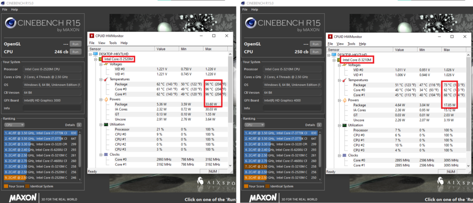 Η απορία μου τώρα είναι αν μπορεί το λάπτοπ αυτό να στηρίξει τον i7 3612qm τόσο θερμικά όσο και από πλευράς ισχύος. Ο 3612qm είναι 4cores/8threads αλλά με tdp στα 35W και φτάνει μέχρι 2.8 GHz σε όλους τους πυρήνες. Ο 3210m φτάνει μέχρι 2.9 GHz σε όλους τους πυρήνες (διπύρηνος), καταναλώνει σύμφωνα με το hwmonitor 17.85W στο cinebench r15 και επιτυγχάνει σκορ 260. Aν ο 3210m έφτανε μέχρι 2.8 GHz, όσο η συχνότητα του 3612qm, η κατανάλωση και το σκορ στο cinebench r15 διαμορφώνονται ως (28/29)*17.85W= 17.2W και (28/29)*260=251 αντίστοιχα. Υποθέτοντας τώρα ότι οι δύο αυτοί επεξεργαστές έχουν πυρήνες ίδιων χαρακτηριστικών, τότε ο 3612qm είναι ουσιαστικά δύο φορές ο 3510m απλά με τη διόρθωση *(28/29) λόγω διαφοράς 0.1 GHz στη συχνότητα. Άρα η αναμενώμενη κατανάλωση ισχύος υπολογίζεται στα 2*17.2W= 34.4W και το σκορ στο cinebench r15 αναμένεται ως 2*251= 502. Αν συγκρίνουμε με τα σκορ στο hwbot τότε πράγματι ο παραπάνω υπολογισμός αποδεικνύεται ορθός. Ο 2520m που υπήρχε στο λαπτοπ, κατανάλωνε 33.6W, δηλαδή μόλις 1W λιγότερο από την αναμενώμενη κατανάλωση του 3612qm. Επομένως από πλευρά τροφοδοσίας δε θα υπάρχει πρόβλημα μιας και το τροφοδοτικό είναι 65W χωρίς μάλιστα να υπάρχει ξεχωριστή κάρτα γραφικών στη μητρική. Από πλευρά θερμοκρασιών όμως αναμένεται μία μικρή αύξηση, οπότε η θερμοκρασία θα χτυπάει 100αρια. Η ψύκτρα στο λάπτοπ έχει ένα μόνο heat pipe. Αλλά πρόσφατα έμαθα ότι η σειρά satellite της toshiba έβγαινε και με ψύκτρα με 2 heatpipes. Μία τέτοια ψύκτρα θα επιφέρει ουσιαστική πτώση της θερμοκρασίας του επεξεργαστή;