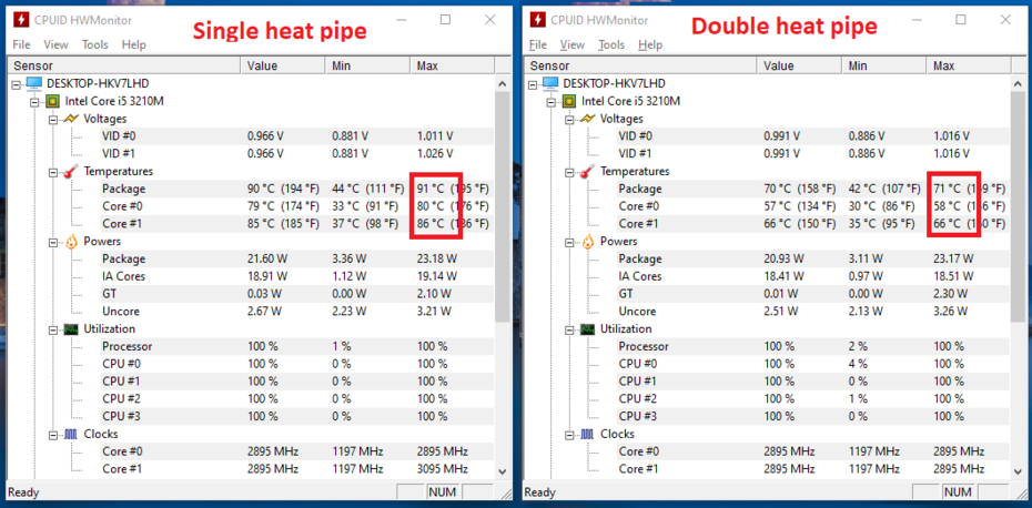 Ήρθε η ψύκτρα. Ακολουθεί συγκριτικό θερμοκρασιών σε 15 λεπτά prime95 max heat σε σταθερή θερμοκρασία δωματίου 28 βαθμών Κελσίου. 20 βαθμοί διαφορά! Ομολογώ πως δεν περίμενα τόσο μεγάλη διαφορά γιατί τα καινούρια heat pipes είναι πιο στενά από το προηγούμενο που υπήρχε.