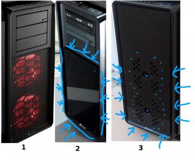 Αν δεις την παρακάτω φωτογραφία 1) από τον κατασκευαστή 2) το είχα τόσο καιρό έτσι δεν είχα θέμα με θερμοκρασίες, η είσοδος του αέρα γίνεται περιμετρικά είχα αφήσει 1cm περιθώριο σύμφωνα με τα βελάκια. Εχω αγοράσει τον silent wings 3 high speed 140 και έκανα κάποιες δοκιμές (και μετρήσεις κάποια στιγμή θα τις ανεβάσω). Στην δεύτερη εικόνα με το plexi ενώ χωρίς εμπόδιο έσπρωχνε αρκετό αέρα (σήκωνες και αετό ) με το plexi μπροστά ήταν τζούφιος! Από'δω οδηγήθηκα στην 3η εικόνα. 3)Με τις τρύπες που άνοιξα δεν έχει πρόβλημα, δεν πήγα στα τυφλά το είχα ψάξει. Δεν αποδίδει στο 100% αν δεν υπήρχε το plexi, αποδίδει στο 75-80% σε σύγκριση με το plexi χωρίς τις τρύπες που απέδιδε στο 30% και με βάση τις στροφές που δουλεύω τους ανεμιστήρες. *Με μπλε βελάκια και τελίτσες τα σημεία εισόδου του αέρα Φίλτρο υπάρχει από τον κατασκευαστή και κάνει δουλειά. Και κάτι που είχες προτείνει για τα καλώδια στο πίσω μέρος και την μακαρονάδα και 3η προσπάθεια με τα κλιπσάκια όπως το κατάλαβα, με τον κόκκινο κύκλο αυτά που έφτιαξα και κρύψιμο της μακαρονάδας Σ'ευχαριστώ @Seafalco για τις προτάσεις σου -