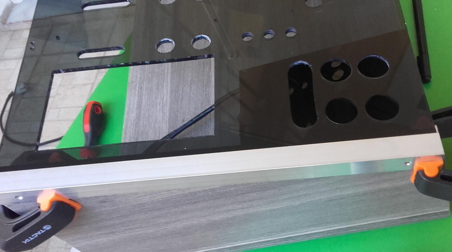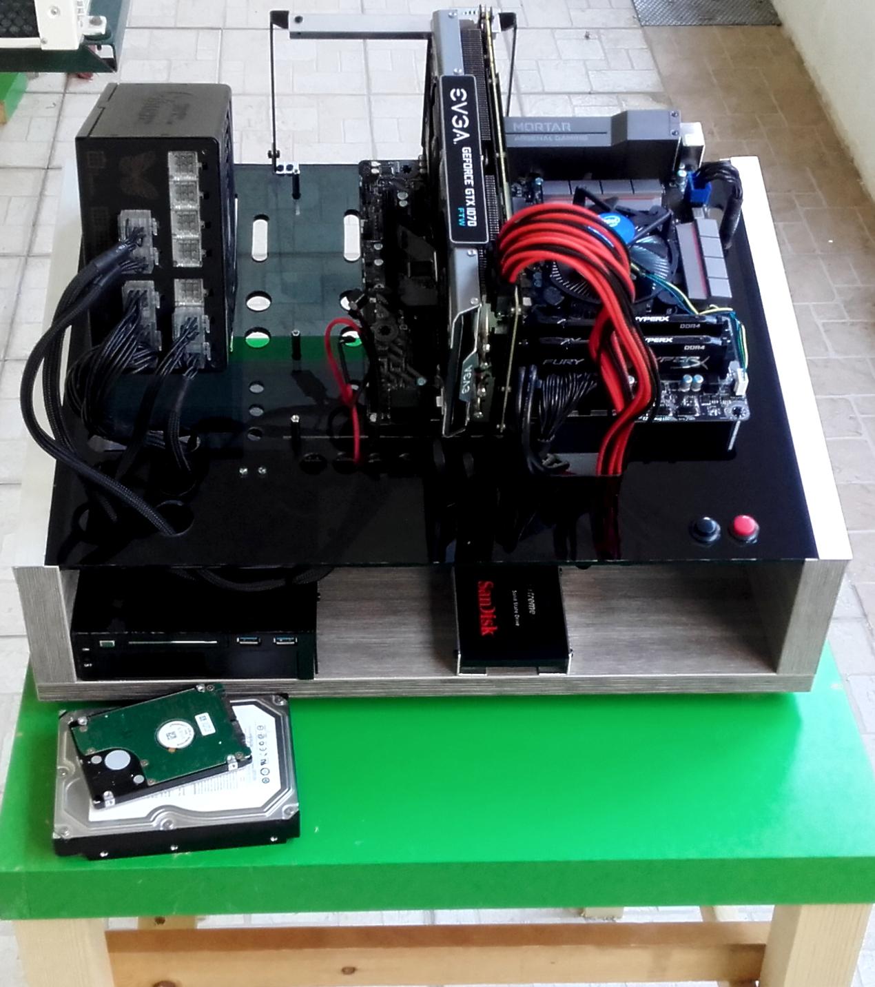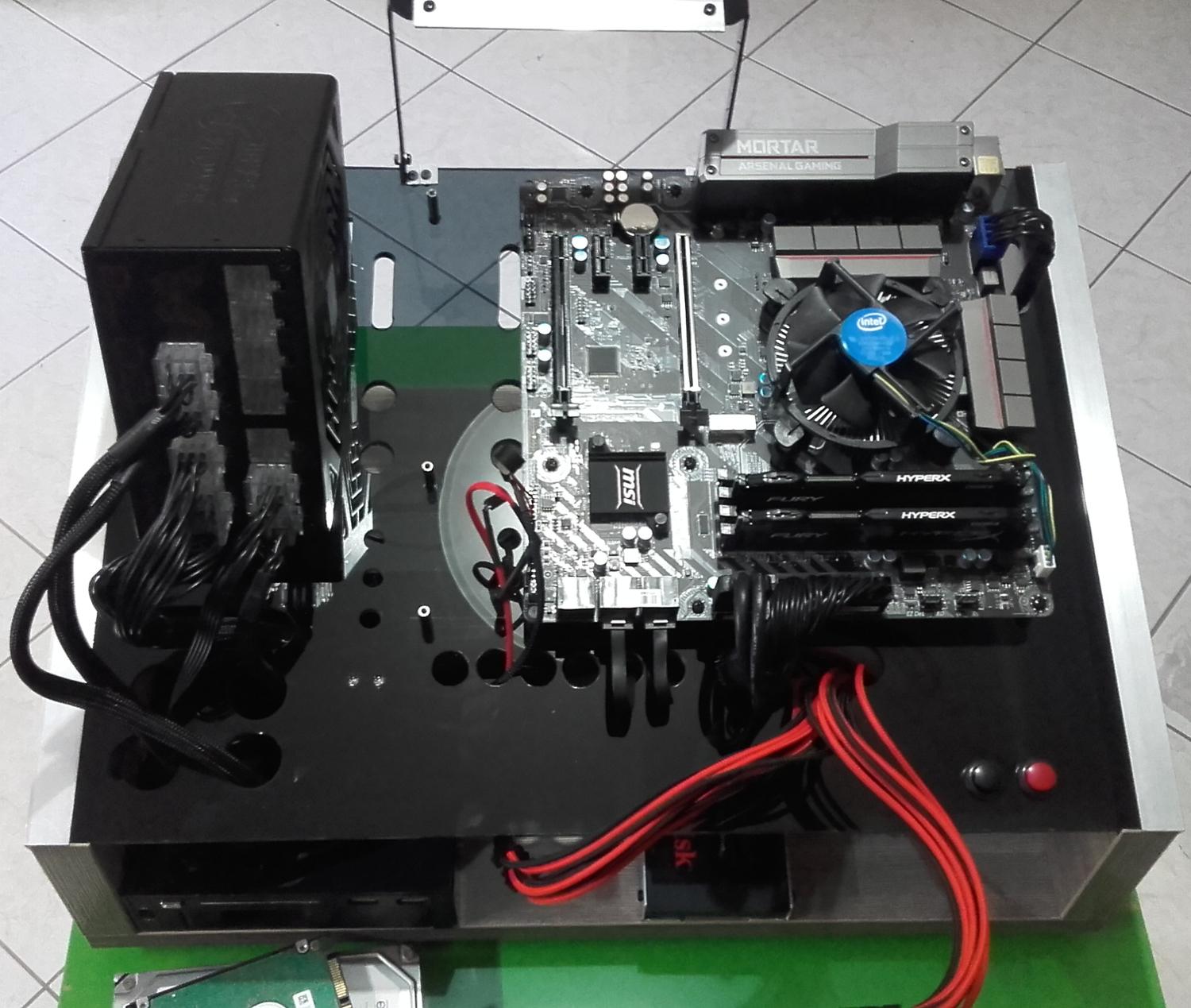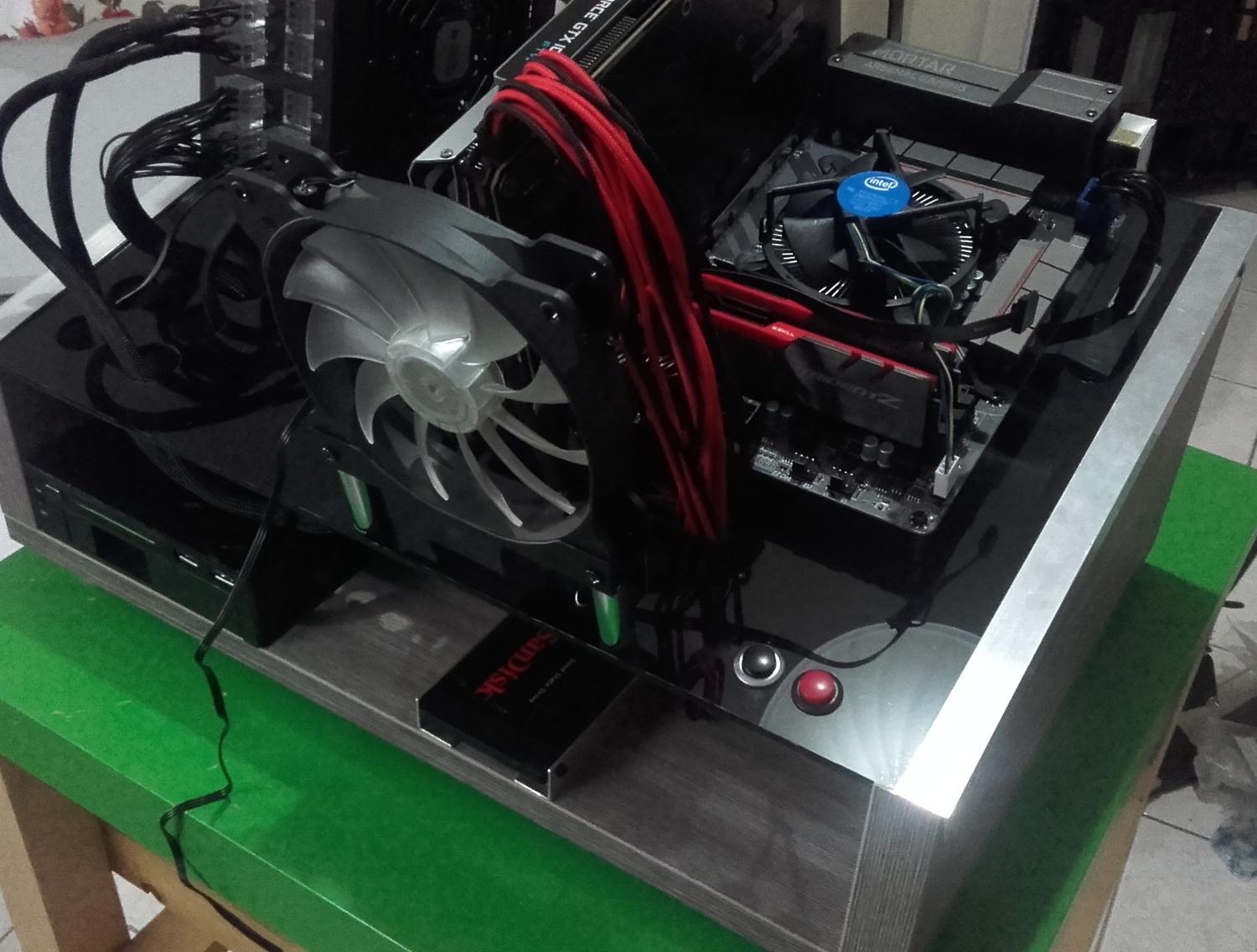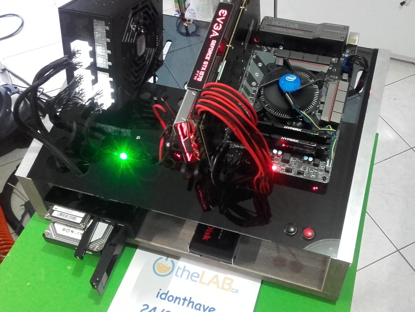 * * * Benchtable Lab Base 69 * * * worklog project Τρίτο κατά σειρά project μου μετά τα " Pumpkin Dr.Dre και την αλλαγή του σε Viper69 '' και "Plexi Bench Modular 69" (εκτελεί χρέη home theater) " παίρνει σειρά το Benchtable Lab Base που θα χρησιμοποιείται στο εργαστήριο για επισκευές και διάφορες μετρήσεις (όταν υπάρχει χρόνος). Υλικά που χρησιμοποιήθηκαν και κόστος plexiglass 5mm 49χ35 (κόστος 8€) μελαμίνη 8mm και 1,8cm (κόστος 20€) σωλήνας inox διάμετρος 15mm - τοίχωμα 1mm ( κόστος 90cm/5€) ποδαράκια 3€ λαστιχένια και καπάκια από absolut (με μέτρο την vodka) 8 μεταλλικοί αποστάτες (2€/0.25€ τεμάχιο) 2 led (κόστος 0.20€) 2 button (κόστος 1.50€ κόκκινος, 1€ μαύρος) sleeve kit black και red υπήρχαν θερμοσυστελλόμενα βίδες, ροδέλες και παξιμάδια 2€ γωνίες αλουμινίου και πλαστικού (κόστος και τα δυο 6€) Σύνολο 51€ Εργαλεία Σέγα, τρυπάνι διαβάθμισης , πολυεργαλείο για τρίψιμο κόψιμο και λείανση, γυαλόχαρτα, σφιγκτήρες, πιστόλι θερμού αέρα, κολλητήρι, πινέλο, γωνιακός τροχός, βάση λύγισμα του plxeiglass κατά γωνία 90°. Κατασκευή Ένωση της μελαμίνης με την βοήθεια των γωνιακών σφιγκτήρων, τρύπημα, ξυλόκολλα και βίδωμα. Όσον αφορά την μελαμίνη χρησιμοποίησα 2 διαφορετικά πάχη 8mm και 18mm, η πιο λεπτή είναι κατά 5mm πιο ψηλή για να δημιουργηθεί το αυλάκι ώστε να κουμπώσει το plexiglass Πήρα το κομμάτι του plexiglass 49x35 και τοποθέτησα τις μητρικές για να σημαδέψω τις οπές, σειρά είχε το τροφοδοτικό για να δω που/πως θα τοποθετήσω τα πράγματα όπως επίσης και τι άλλες τρύπες/κοψίματα θα πρέπει να γίνουν για το πέρασμα των καλωδίων. εφόσον έγιναν τα παραπάνω άρχισα τα τρυπήματα και τα κοψίματα με την βοήθεια τρυπανιού διαβαθμίσεως και της σέγας Έπρεπε να φτιάξω βάση για την στήριξη της κάρτας γραφικών ή άλλης κάρτας, αφού μέτρησα και σημάδεψα που θα έμπαινε, έκοψα σωλήνα plexiglass, τον χρησιμοποίησα ως κολονάκια πάνω στα οποία θα ακουμπούσα γωνία αλουμινίου. Για να στηριχθούν τα κολονάκια χρησιμοποίησα πλαστικούς αποστάτες και αφού ζέστανα τον σωλήνα τοποθέτησα σε κάθε άκρη από έναν για να μπορέσω να βιδώσω και στηρίξω την βάση. ΌΜΩΣ έφαγα άκυρο μιας και οι σωλήνες* εμπόδιζαν τις θύρες, δεν θα μπορούσα να κουμπώσω το βύσμα στην κάρτα γραφικών. Από ρετάλια που έχω από plexiglass πήρα κομμάτι 2mm σχεδίασα και το χρησιμοποίησα αντί για του σωλήνες και αφού τα ζέστανα έκανα και τα απαραίτητα λυγίσματα, έκοψα και από το αλουμίνιο και έφτιαξα μικρές γωνίες για να τα στηρίξω. *Οι σωλήνες χρησιμοποιήθηκαν αλλού, θα δείτε στο τέλος που Πάμε στου δίσκους, ήθελα κάτι για πιο γρήγορη πρόσβαση (τυχερός) μου είχε ξεμείνει tray συρταριού για 3,5", 2,5" και extra (USB3 ports). Έπρεπε να κάνω κάποιες μετατροπές για την στήριξη του, επίσης έφτιαξα και μια καλυπτρα για να μην είναι χύμα. Η καλύπτρα λυγίστηκε με το πιστόλι θερμού αέρα και με το "εργαλείο" που είχα φτιάξει παλιότερα για να μπορώ να λυγίζω σε 90 μοίρες. Επίσης έφτιαξα και μια extra βασουλα για 2,5 δίσκο από την γωνία αλουμινίου που είχα. Πάμε και στο σημείο που γέλασα, κάπου είναι χρήσιμα και τα πιώματα που κάνουμε Κοιτώντας τιμές για τα ποδαράκια μιας και είχα χρησιμοποιήσει παλιότερα της lian li (τα είχα πάρει 5-6€) τώρα είχαν 9-10€ και δεν ήταν άμεσα διαθέσιμα και το giveaway από τον διαγωνισμό έτρεχε, έψαχνα εναλλακτική. Έπεσε το μάτι μου πάνω στα άδεια μπουκάλια από absolut που έχω κρατήσει, παρατηρώντας καλύτερα βλέπω τα καπάκια (ασήμι, μεγάλα σε μέγεθος) και εκεί αρχίζω να παίρνω πάλι μπρος (ως αναλαμπή μου έρχονται κάτι λαστιχένια ποδαράκια που είχα δει στο eshop), μετράω (στο καπάκι) εσω