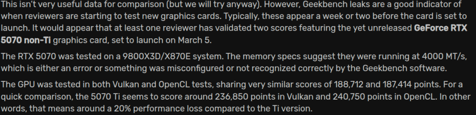 GeForce RTX 5070 Ti leak: 7.6% faster than 4070 Ti SUPER in Blender, on par with RTX 4080 SUPER in OpenCL test - VideoCardz.com VIDEOCARDZ.COM RTX 5070 Ti is 7.6% faster than 4070 Ti SUPER and 20% faster than 4070 Ti in Blender Here’s what to expect from the soon-to-be-released RTX 5070 Ti in Blender rendering. We were notified by... ------------------ NVIDIA confirms GeForce RTX 5070 Ti launches February 20, RTX 5070 on March 5 - VideoCardz.com VIDEOCARDZ.COM NVIDIA confirms February 20 launch date for 5070 Ti, pushes RTX 5070 non-Ti back to March 5 The Ti model arrives almost two weeks before the non-Ti version. Despite what the picture above may... -------------- NVIDIA RTX 5070 and RTX 5060 launch now expected in March and April - VideoCardz.com VIDEOCARDZ.COM NVIDIA GB205 production said to face delays According to analyst Ming-Chi Kuo, NVIDIA may have to push back two of its upcoming launches by a month. Yesterday, news broke that NVIDIA will move... -