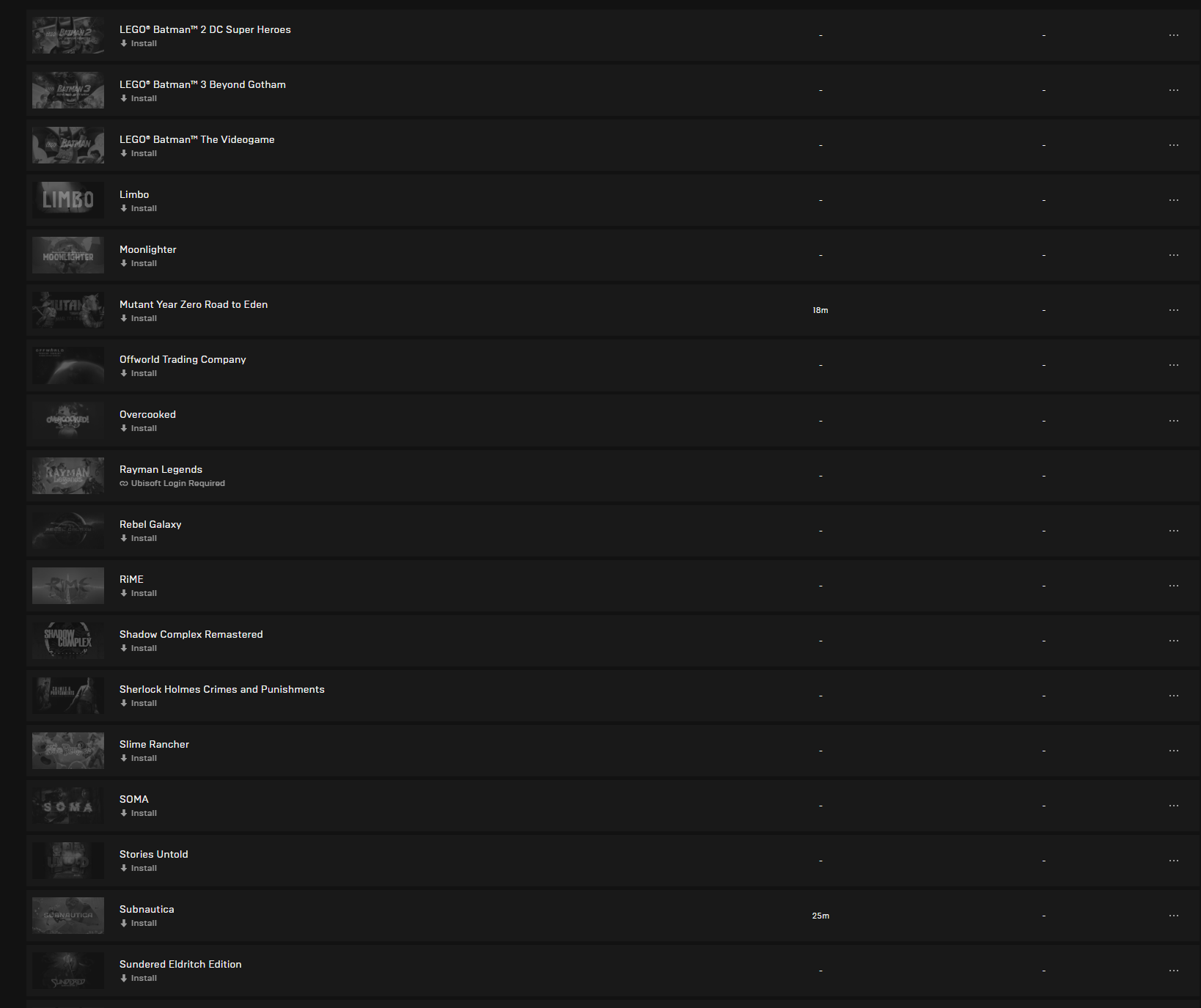 Δεν ξέρω αν το κάνεις από αντίδραση Μιχάλη, αλλά τσεκ δις άουτ (και δεν τα'χω πάρει όλα) Όλα free για να τα κρατήσεις. Δεν τα λες και λίγα. Κάποια από αυτά τα έχω παίξει μέσω Steam, οπότε απλά τα έχω "διπλά". Δεν λέω ότι είναι state of the art παιχνίδια, αλλά μερικά είναι καλά και έχεις την ευκαιρία να τα δοκιμάσεις όποτε επιθυμείς Είχα Epic Account από την εποχή που τα μόνα παιχνίδια που είχε o client ήταν το fortnite (σε beta )και το Shadow complex. Δεν νιώθω ότι κάτι άλλαξε. Τώρα, αν στέλνει πληροφορίες στην Κίνα, ποσώς με ενδιαφέρει -