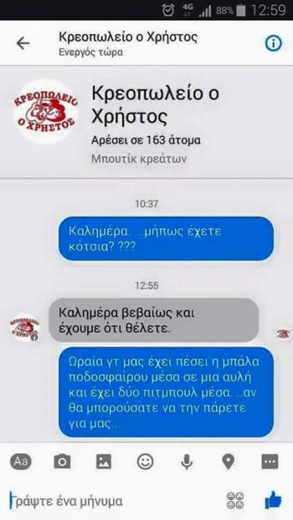 - Που ήσουν όλη μερα; - Με τα κορίτσια,παίζαμε Θανάση.. -Και ο άσπρος λεκές πάνω στην μπλούζα σου; - Εε κάποια στιγμή ο Θανάσης τελείωσε..