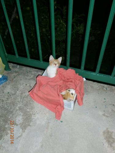 κανονικά είχε τέσσερα. Δυο καφετιά (αυτα στη φωτό) και άλλα δύο στην αποχρωσή του. Αλλά εκείνα τα κράτησε η μαμά (ηταν θυλυκα) που δυστυχώς έφυγε από το σπίτι μας, και μας άφησε τα αρσενικά μαζί με το μπαμπά. Επισης ο μπαμπας οποια γατα και αν περνουσε απο την αυλη μας, ειχαμε γατομαχιες. Δεν αφηνε καμια να πλησιασει. Αυτα δεν τα πειραζει καθολου.