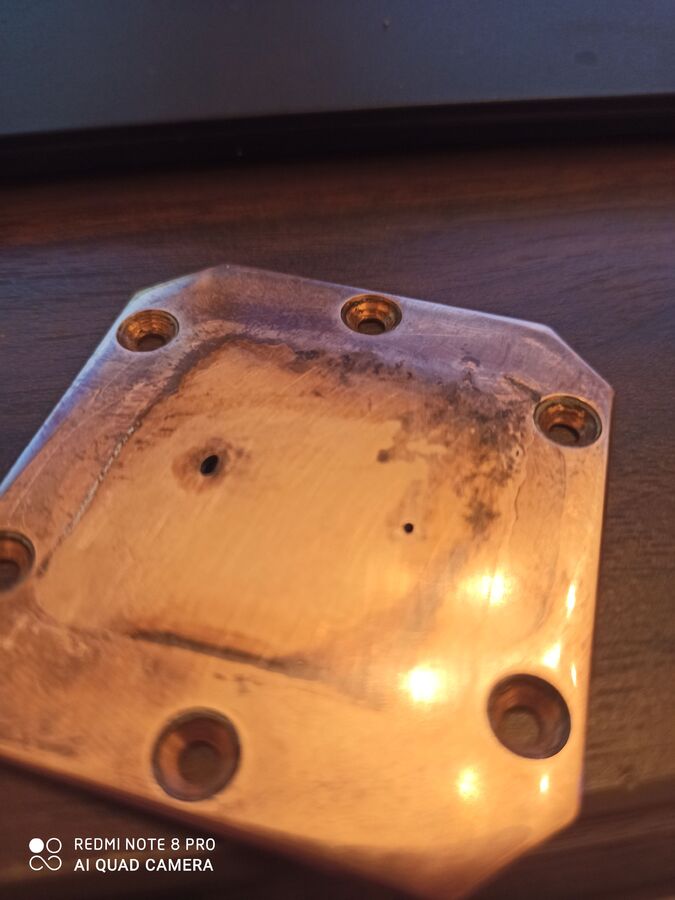 μωρε αυτο ειναι το προφανες, και ολα εκει συνηγορουν, αφου εχουμε δυο τρυπες στο πουθενα με μηδενικη περιφεριακη φθορα γυρω τους, αλλα ΠΟΛΥ κουλο να τυχει σε δυο σημεια... Και δηλαδη απο ποιος ξερει ποσες εκατονταδες κιλα ηταν το φυλο, στο cpu block μου ετυχε η στραβη? Οχι, το μαυρο ειναι μπλε σκουρο, τιποτε αλλο... προφανως δεν ειναι καν οξειδωση αλλα σκετο χρωμα γιατι ειχα μαυρο και μετα μπλε ζουμι μεσα. Παιδια μια φωτο με το κινητο ειναι, δεν ειναι καμια μακρο με dslr... και δε το γυαλισα για να βγαλω τη φωτο... μου φανηκε αχρηστο κατι τετοιο. Αλλα ακομα κι αν ηταν, παλι δεν υπαρχει περιφεριακη φθορα και θα ηταν ακομα πιο κουλο...