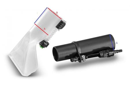 Το εξάρτημα της KARCHER έχει κωδικό 2.885-018.0 και έρχεται όπως το βλέπεις στην εικόνα. Η εσωτερική διάμετρος του διάφανου εξαρτήματος στο σημείο Α είναι 34.4mm στο σημείο Β 35.6mm και η απόσταση μεταξύ τους είναι 45mm. Στο μαύρο εξάρτημα η εσωτερική διάμετρος στο σημείο Δ είναι 35mm. -