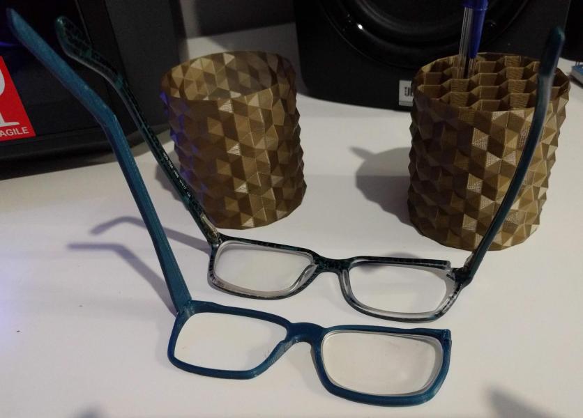 3d εκτυπωμένο τριποδάκι για κινητό (PETG πλαστικό) έτοιμα σχέδια από thingiverse. Αρκετά καλό και ανθεκτικό όταν χρησιμοποιήθηκε για την λήψη εδώ. Σκελετός γυαλιών δικό μου σχέδιο σε fusion 360, για φθηνό προσωρινό ανταλλακτικό για μια φίλη. Πάλι 3d printed σε PETG πλαστικό στο οποίο έδωσα και καμπύλη σε μερικά σημεία με θερμοπίστολο. Λίγο χάος στον τομέα των μεγεθών και σχημάτων στους σκελετούς παρατήρησα. Πίσω από τα γυαλιά 3d printed σε PLA πλαστικό μολυβοθήκες.